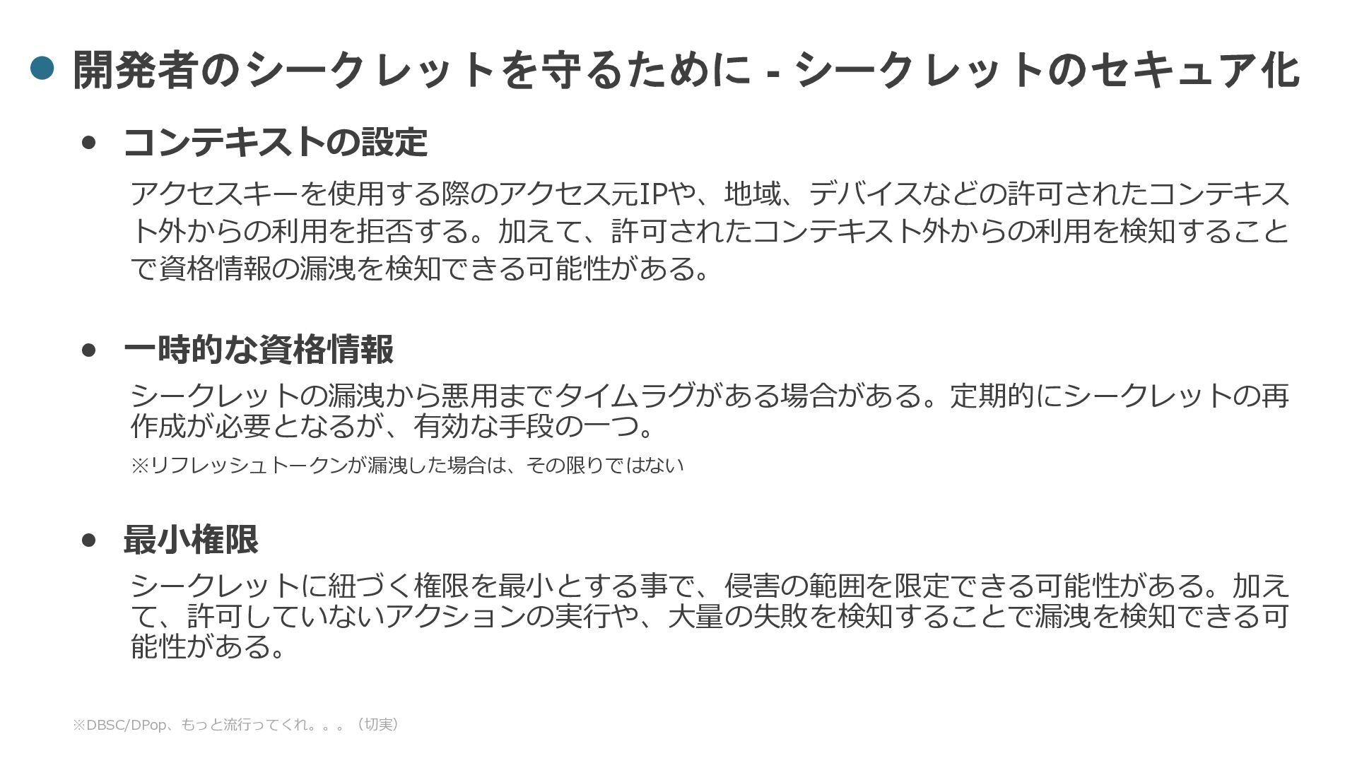 一時的な資格情報 シークレットの漏洩から悪用までタイムラグがある場合がある。定期的にシークレットの再 作成が必要となるが、有効な手段の一つ。 ※リフレッシュトークンが漏洩した場合は、その限りではない • 最小権限 シークレットに紐づく権限を最小とする事で、侵害の範囲を限定できる可能性がある。加え て、許可していないアクションの実行や、大量の失敗を検知することで漏洩を検知できる可 能性がある。 ※DBSC/DPop、もっと流行ってくれ。。。(切実)