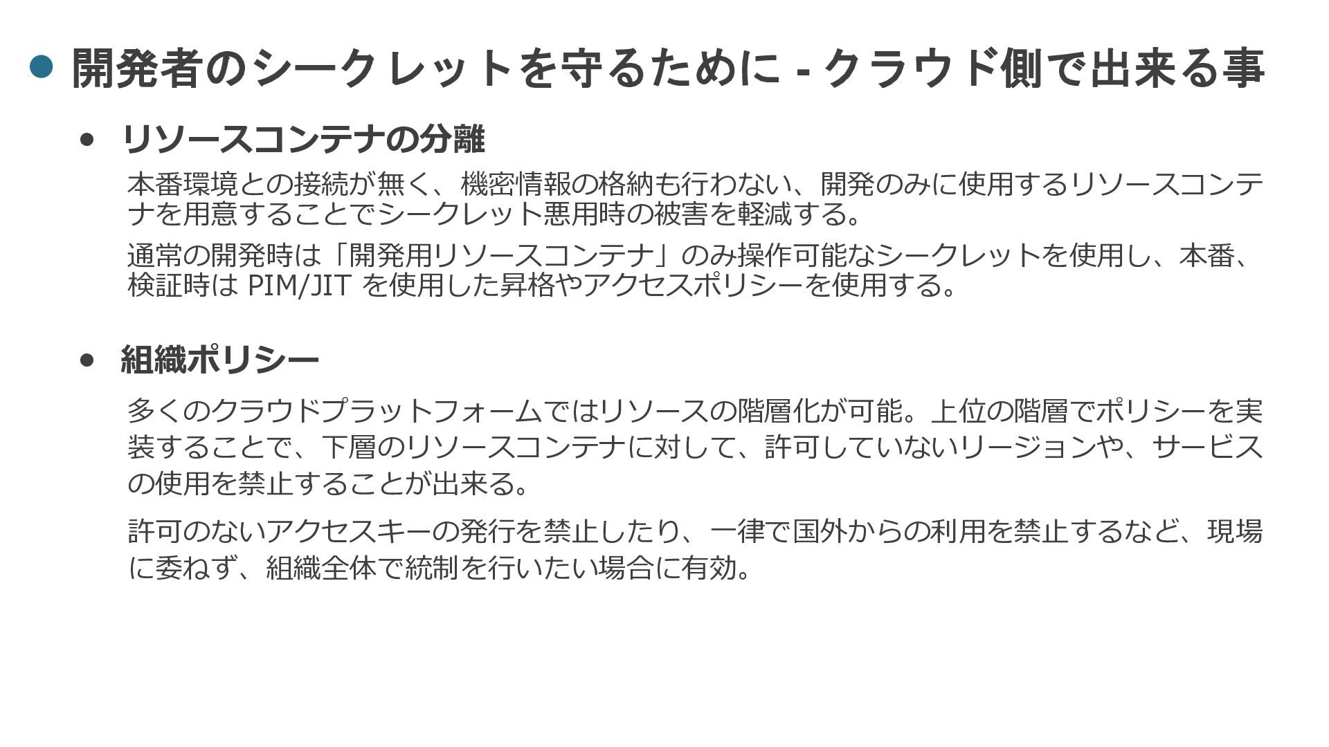 PIM/JIT を使用した昇格やアクセスポリシーを使用する。 • 組織ポリシー 多くのクラウドプラットフォームではリソースの階層化が可能。上位の階層でポリシーを実 装することで、下層のリソースコンテナに対して、許可していないリージョンや、サービス の使用を禁止することが出来る。 許可のないアクセスキーの発行を禁止したり、一律で国外からの利用を禁止するなど、現場 に委ねず、組織全体で統制を行いたい場合に有効。