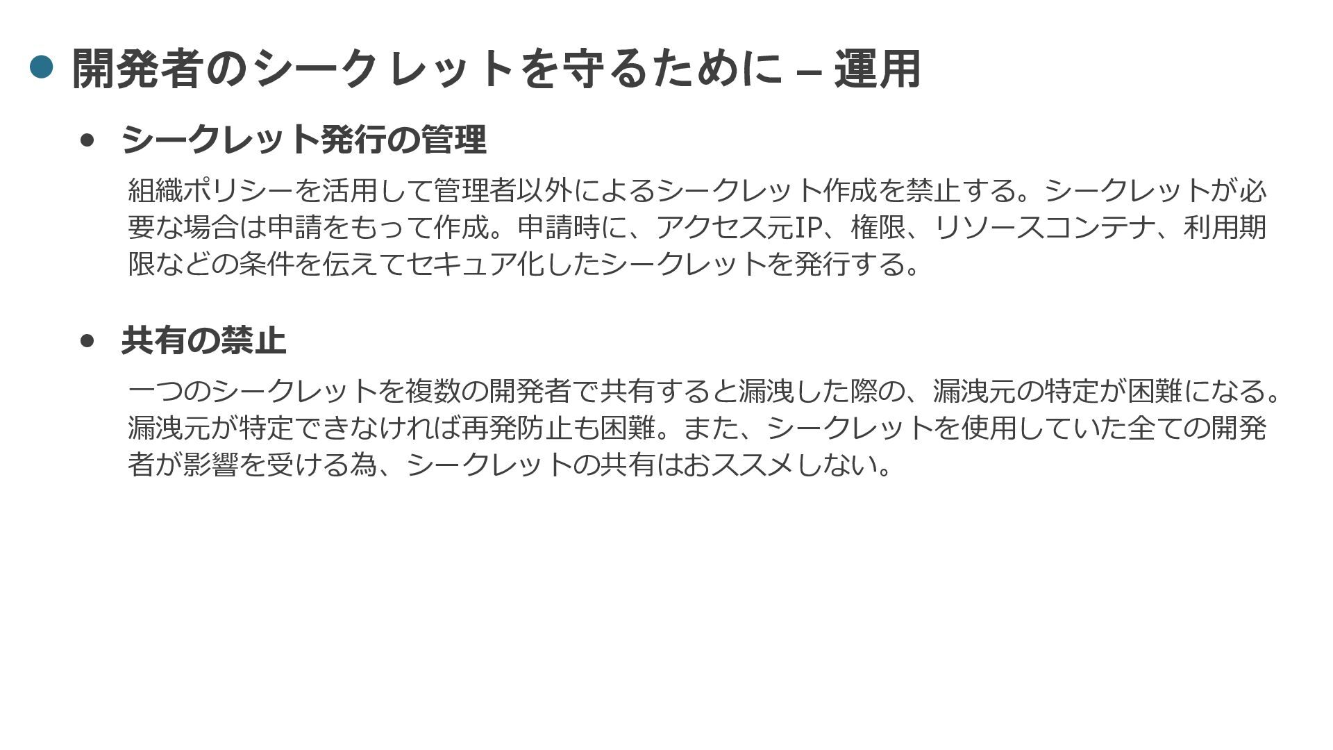 共有の禁止 一つのシークレットを複数の開発者で共有すると漏洩した際の、漏洩元の特定が困難になる。 漏洩元が特定できなければ再発防止も困難。また、シークレットを使用していた全ての開発 者が影響を受ける為、シークレットの共有はおススメしない。