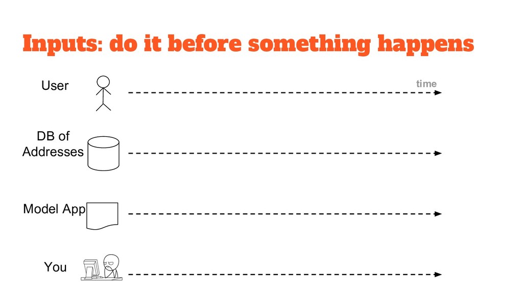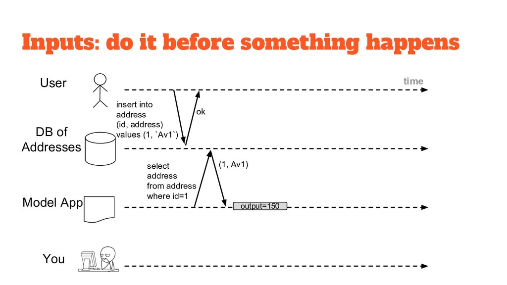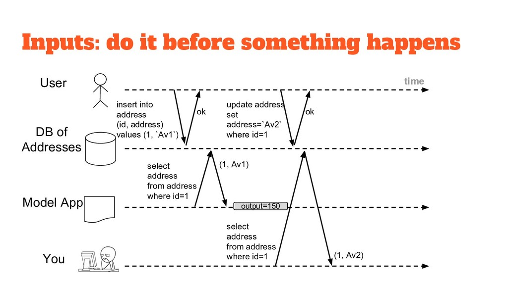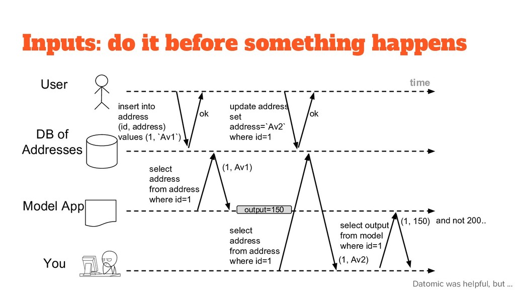 You Model App time ok insert into address (id, address) values (1, `Av1`) update address set address=`Av2` where id=1 (1, Av1) select address from address where id=1 select address from address where id=1 (1, Av2) select output from model where id=1 (1, 150) output=150 and not 200.. ok Datomic was helpful, but ...