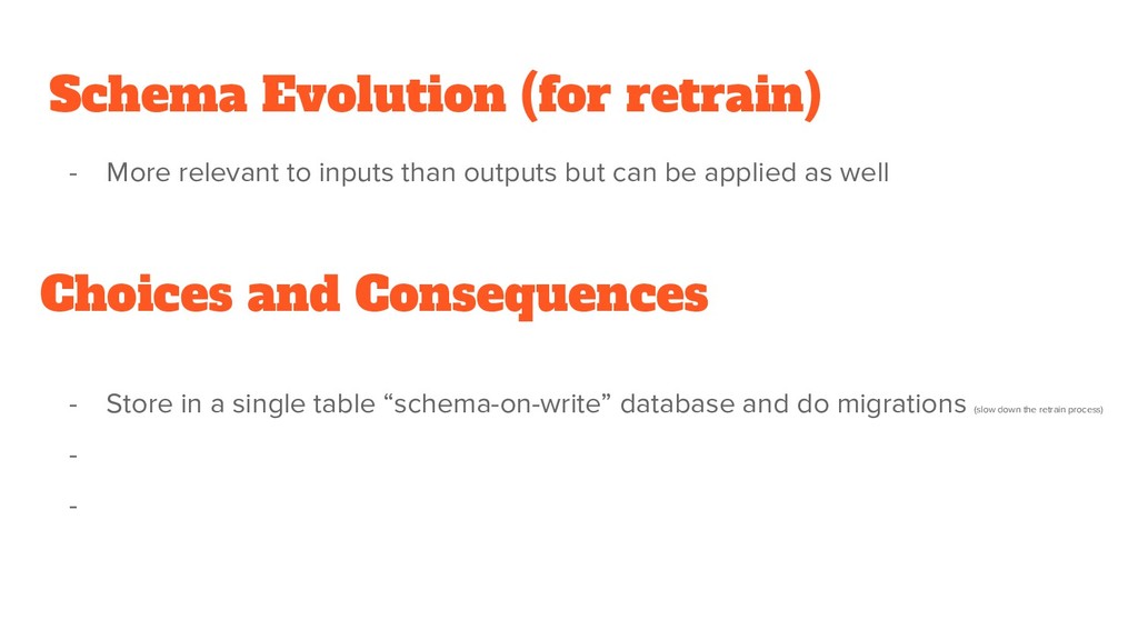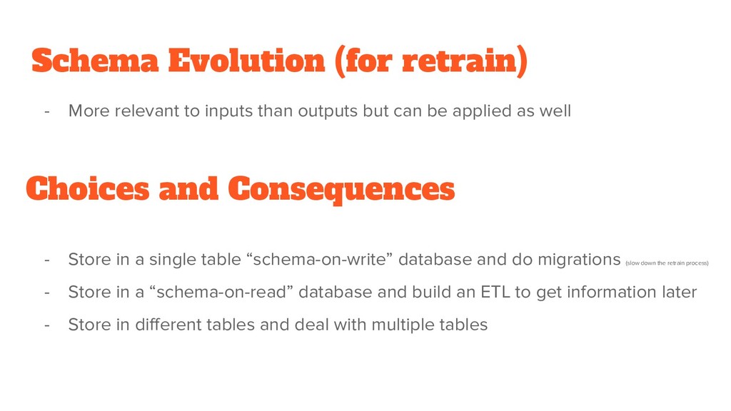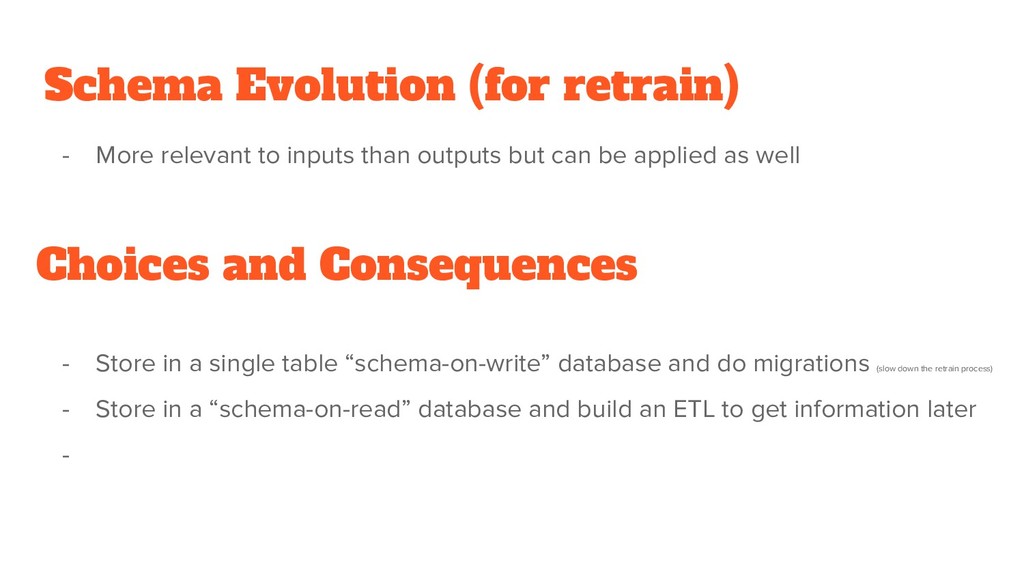 outputs but can be applied as well Choices and Consequences - Store in a single table “schema-on-write” database and do migrations (slow down the retrain process) - -