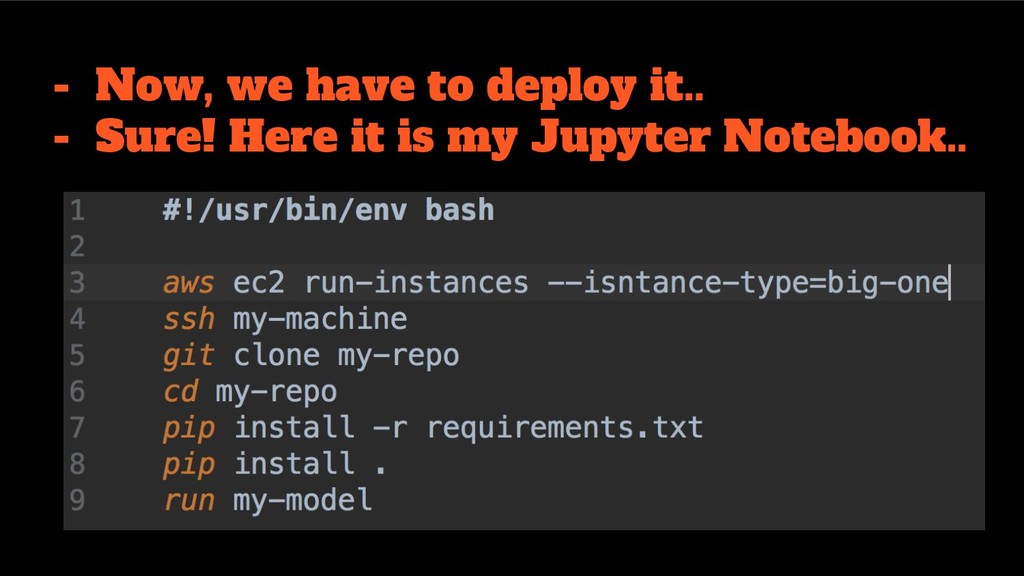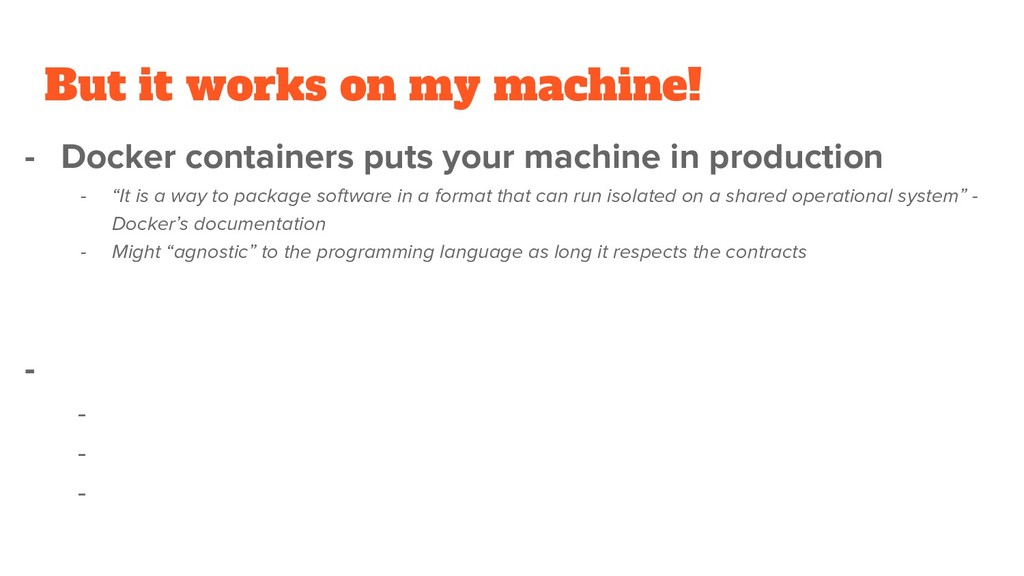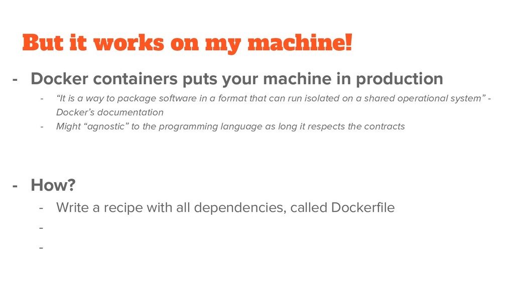 your machine in production - “It is a way to package software in a format that can run isolated on a shared operational system” - Docker’s documentation - Might “agnostic” to the programming language as long it respects the contracts - How? - Write a recipe with all dependencies, called Dockerfile - -