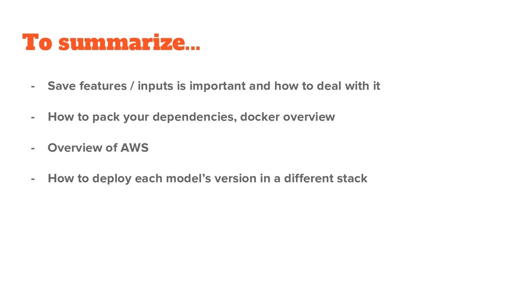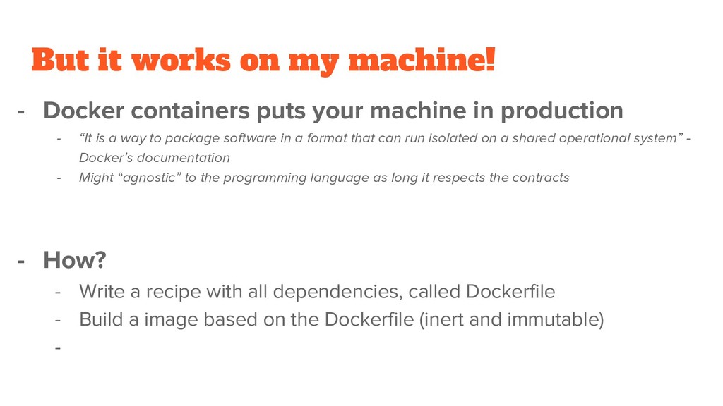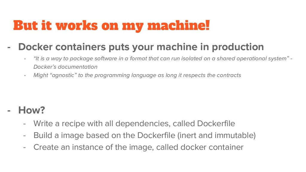 your machine in production - “It is a way to package software in a format that can run isolated on a shared operational system” - Docker’s documentation - Might “agnostic” to the programming language as long it respects the contracts - How? - Write a recipe with all dependencies, called Dockerfile - Build a image based on the Dockerfile (inert and immutable) -