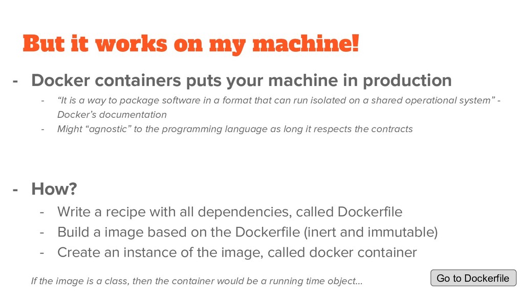 your machine in production - “It is a way to package software in a format that can run isolated on a shared operational system” - Docker’s documentation - Might “agnostic” to the programming language as long it respects the contracts - How? - Write a recipe with all dependencies, called Dockerfile - Build a image based on the Dockerfile (inert and immutable) - Create an instance of the image, called docker container If the image is a class, then the container would be a running time object… Go to Dockerfile