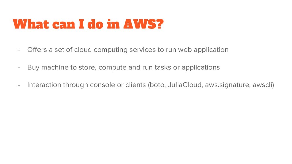 of cloud computing services to run web application - Buy machine to store, compute and run tasks or applications - Interaction through console or clients (boto, JuliaCloud, aws.signature, awscli)