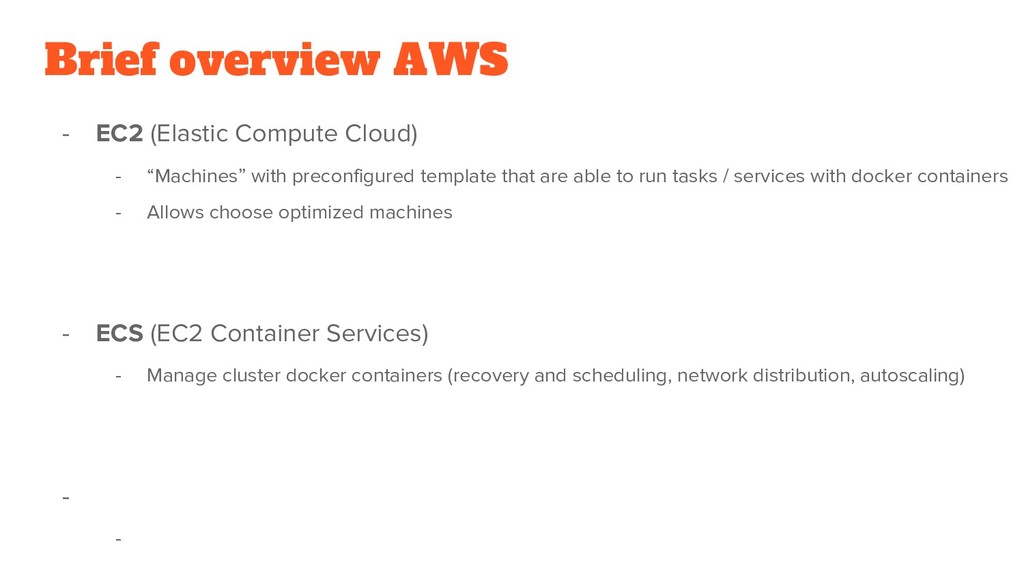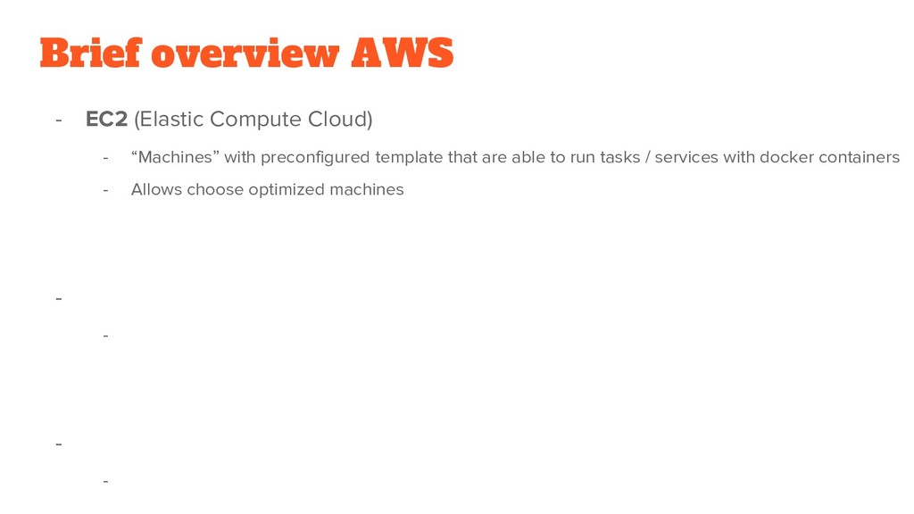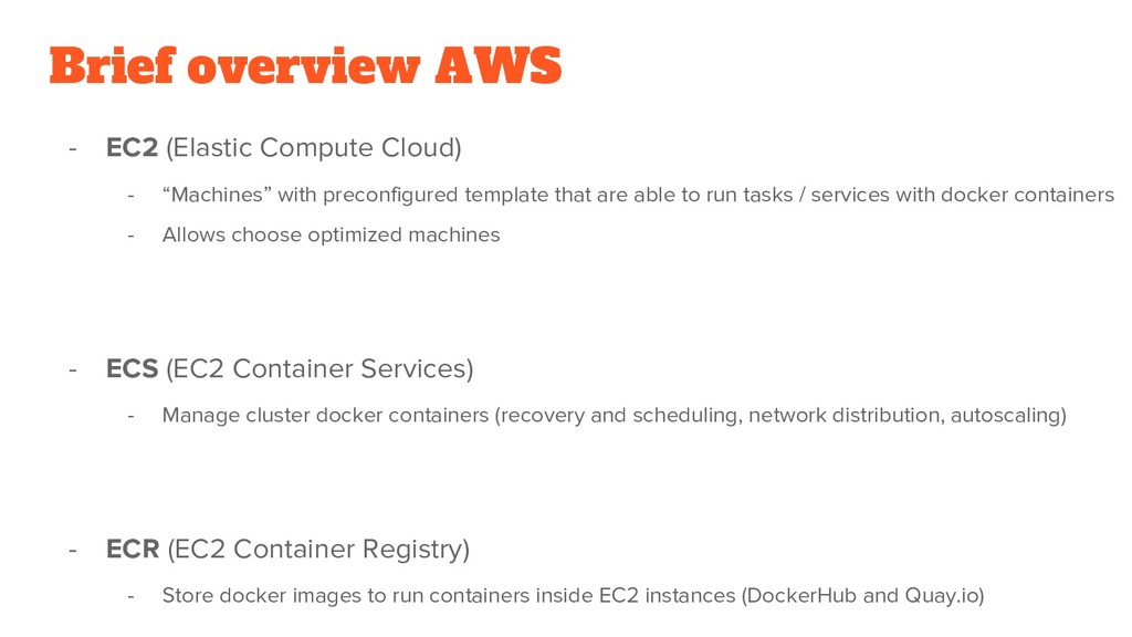 with preconfigured template that are able to run tasks / services with docker containers - Allows choose optimized machines - ECS (EC2 Container Services) - Manage cluster docker containers (recovery and scheduling, network distribution, autoscaling) - ECR (EC2 Container Registry) - Store docker images to run containers inside EC2 instances (DockerHub and Quay.io)