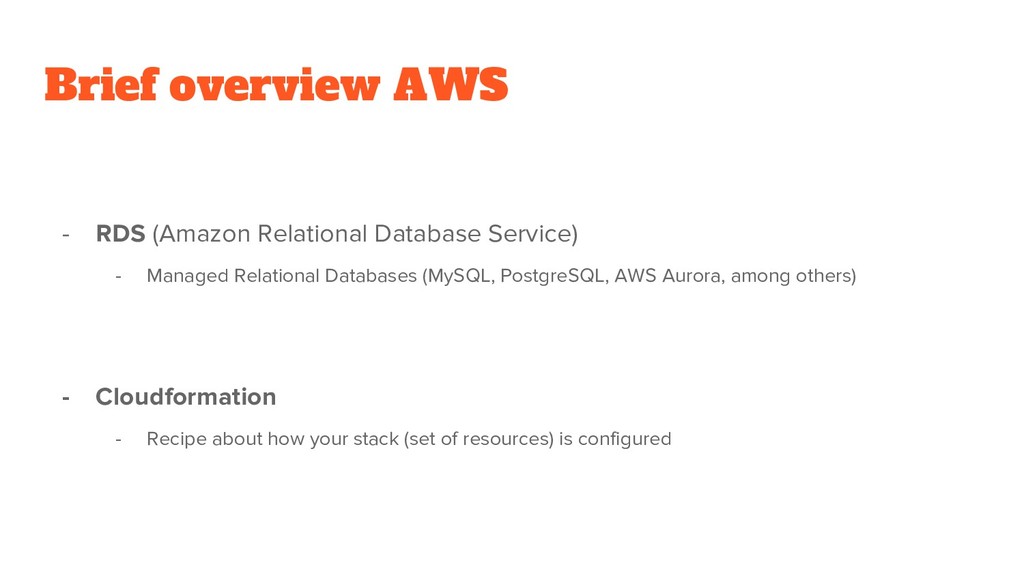 Managed Relational Databases (MySQL, PostgreSQL, AWS Aurora, among others) - Cloudformation - Recipe about how your stack (set of resources) is configured