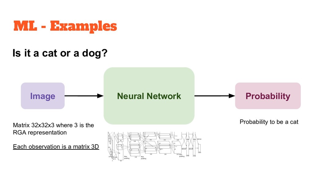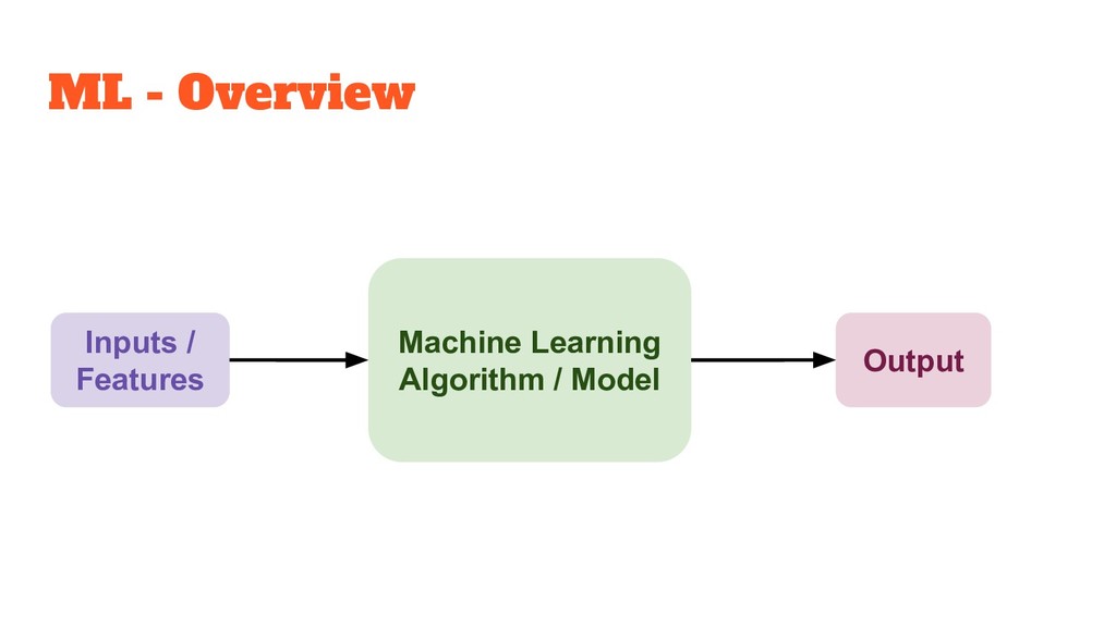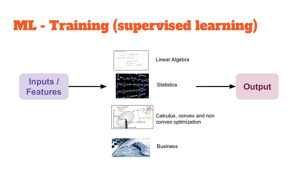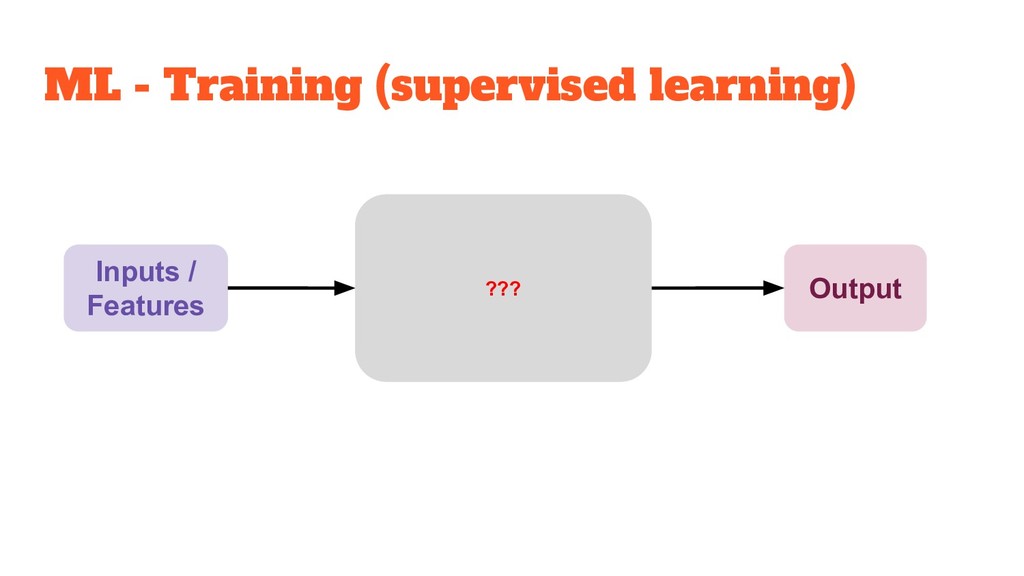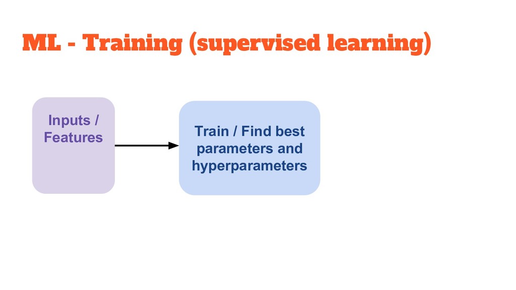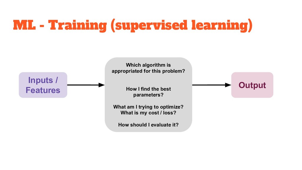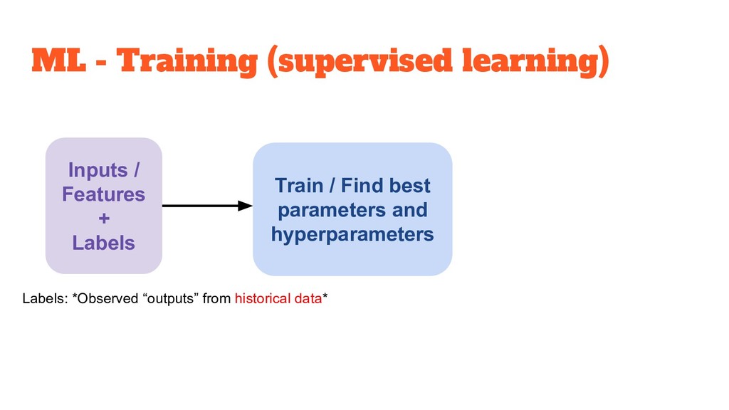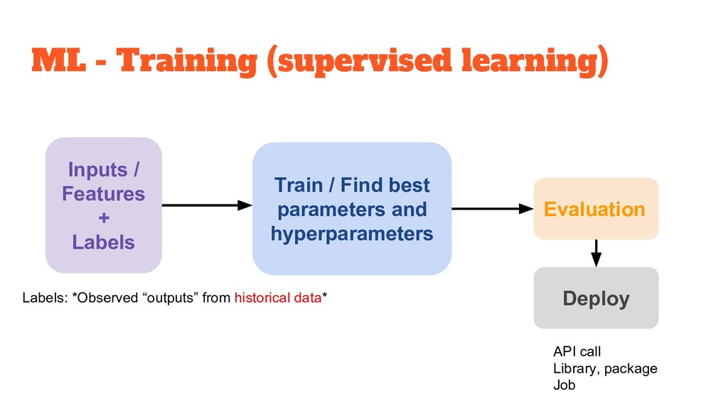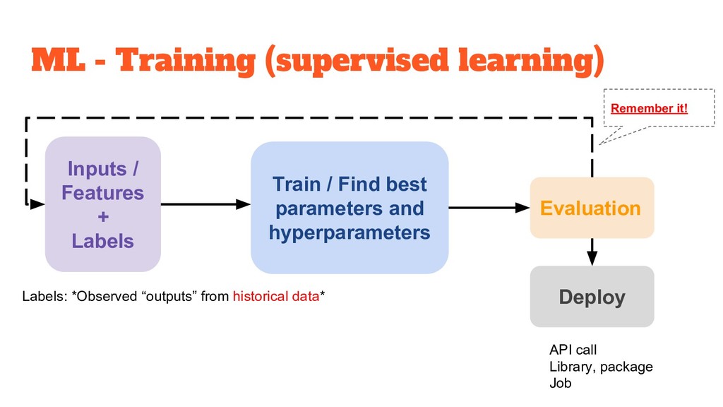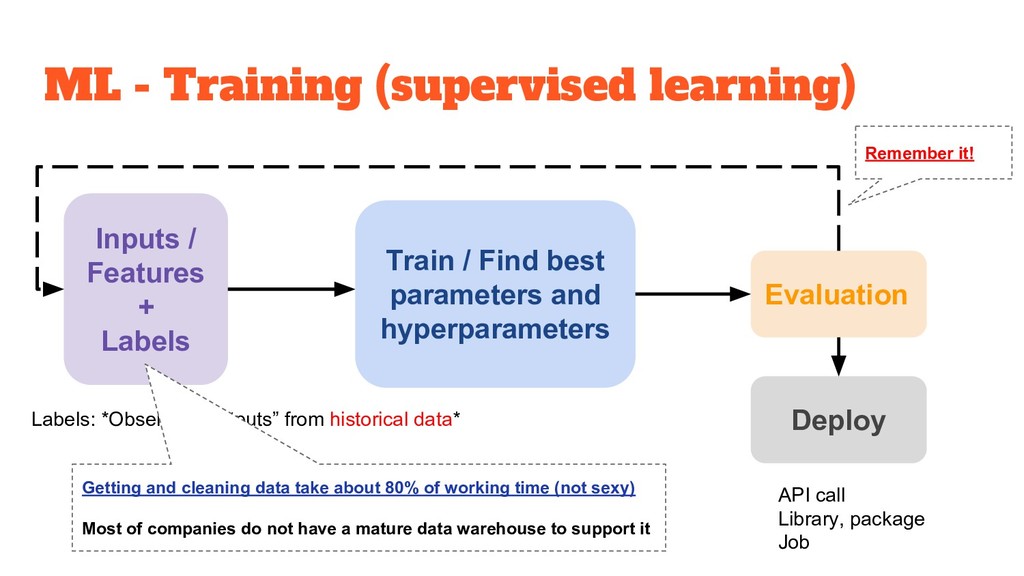 Labels: *Observed “outputs” from historical data* Train / Find best parameters and hyperparameters Evaluation Deploy Remember it! Getting and cleaning data take about 80% of working time (not sexy) Most of companies do not have a mature data warehouse to support it API call Library, package Job