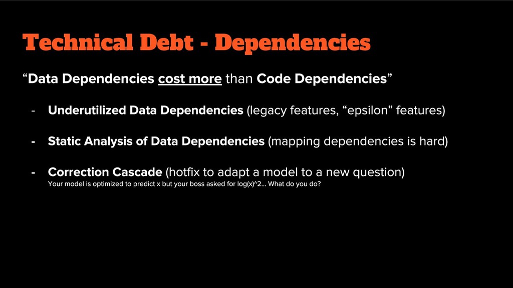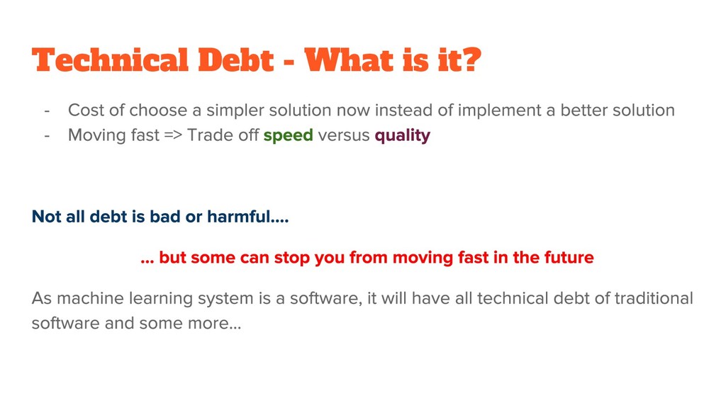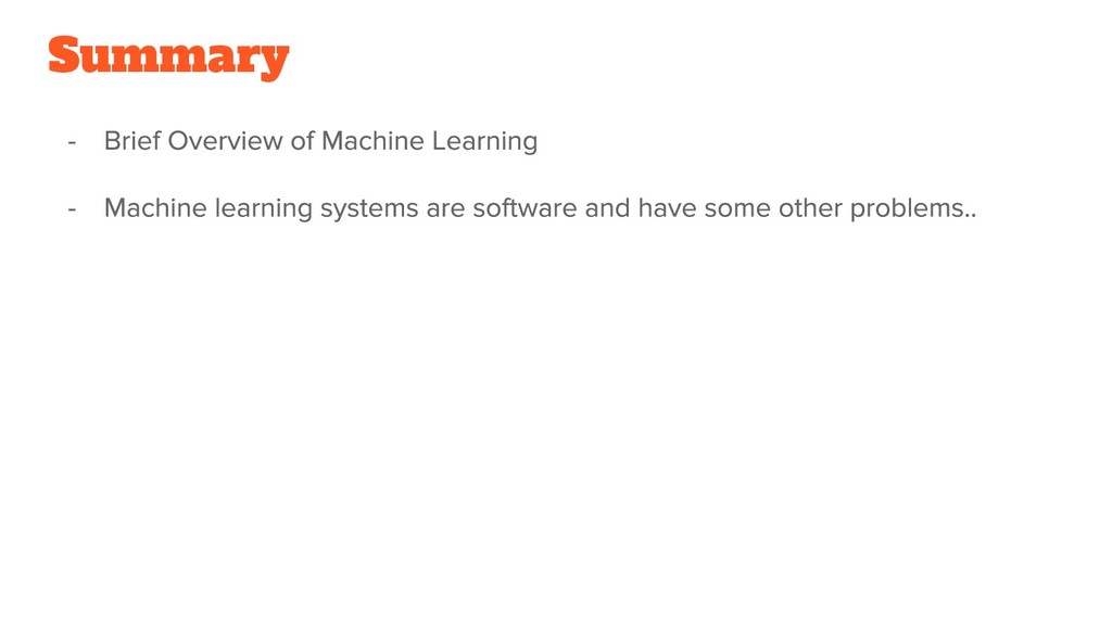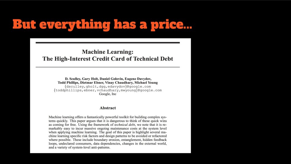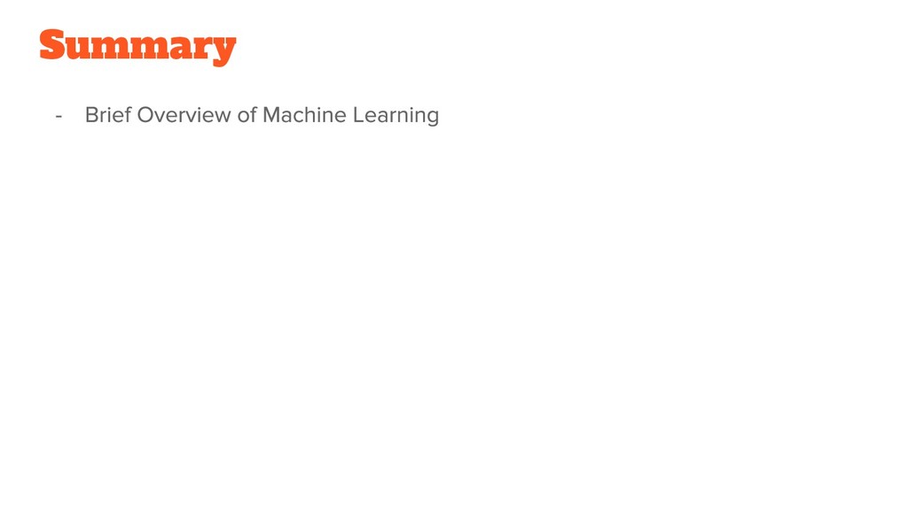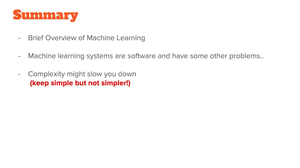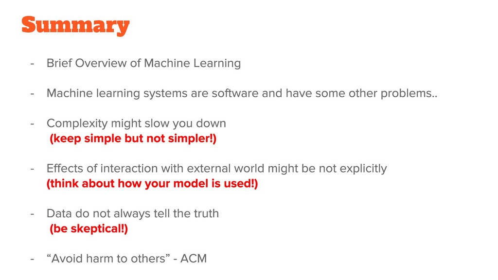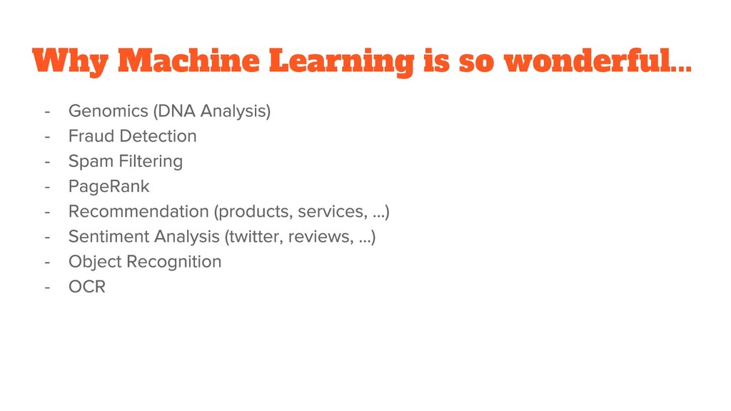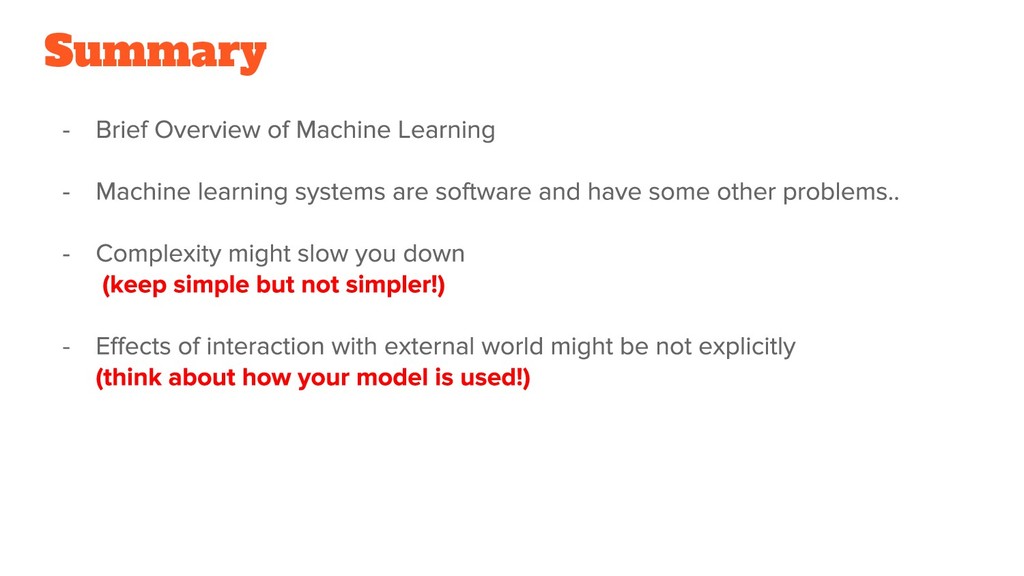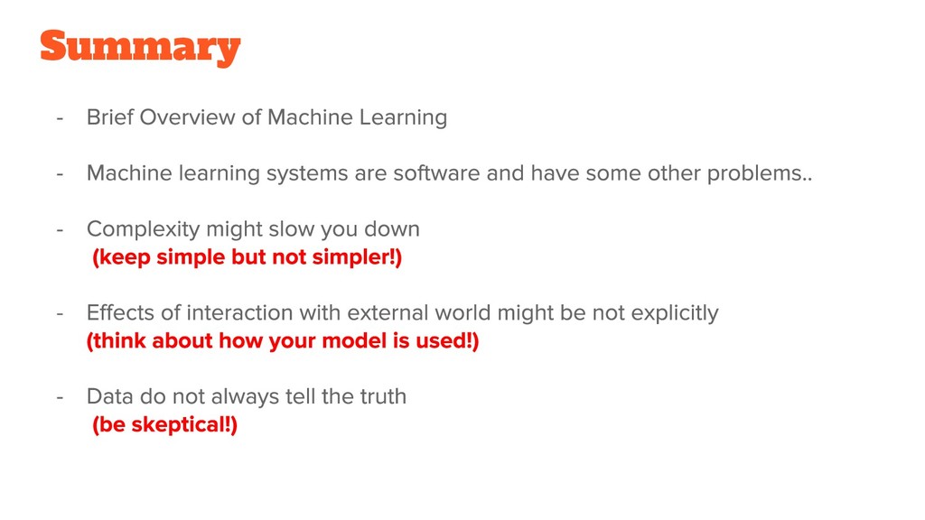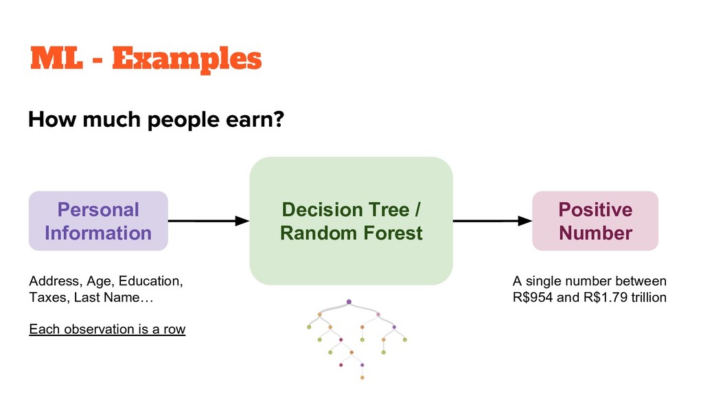 Labels: *Observed “outputs” from historical data* Train / Find best parameters and hyperparameters Evaluation Deploy Remember it! Getting and cleaning data take about 80% of working time (not sexy) Most of companies do not have a mature data warehouse to support it API call Library, package Job