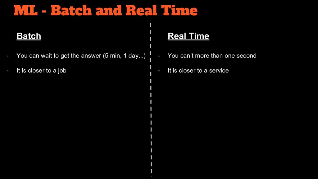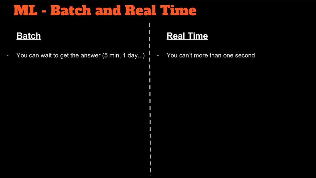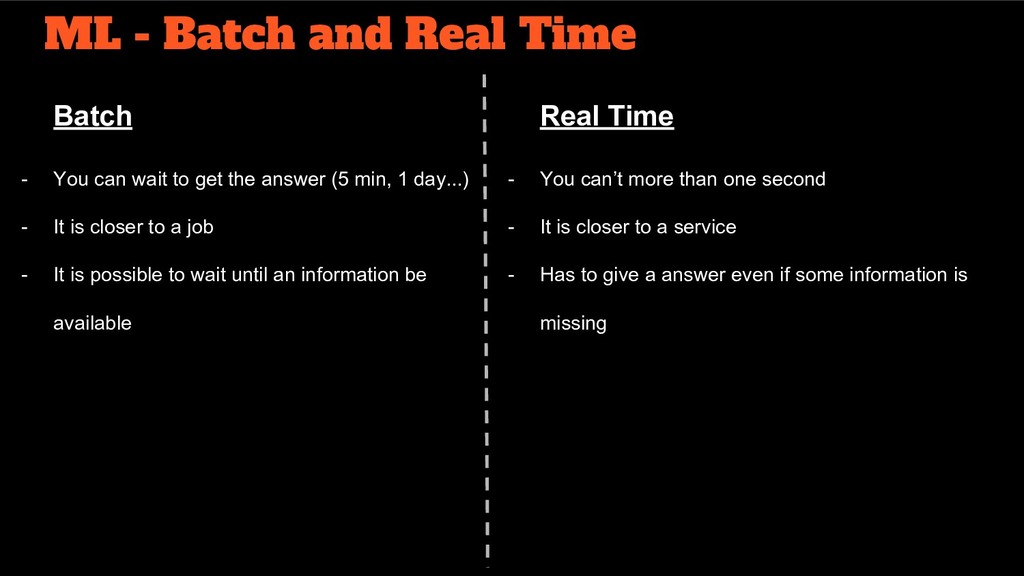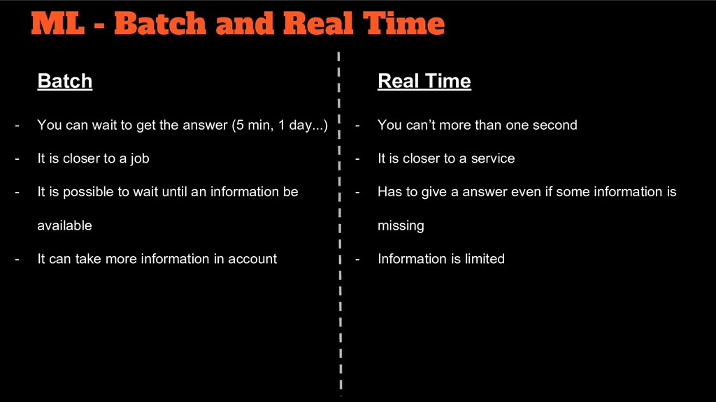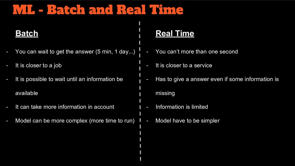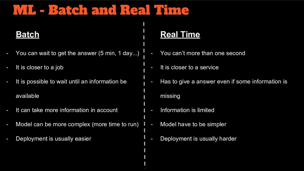wait to get the answer (5 min, 1 day...) - It is closer to a job - It is possible to wait until an information be available - It can take more information in account - Model can be more complex (more time to run) - Deployment is usually easier Real Time - You can’t more than one second - It is closer to a service - Has to give a answer even if some information is missing - Information is limited - Model have to be simpler - Deployment is usually harder