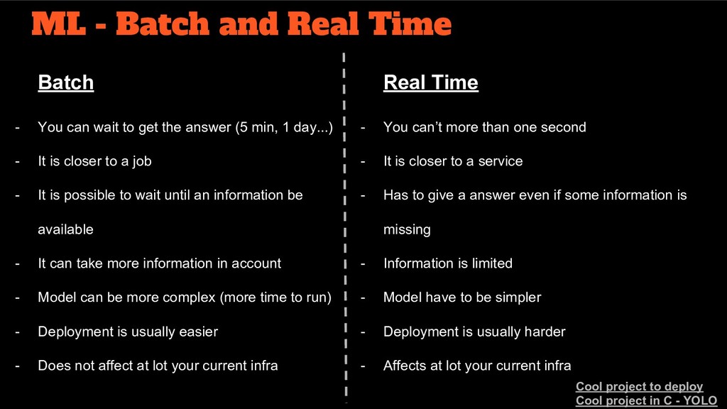 wait to get the answer (5 min, 1 day...) - It is closer to a job - It is possible to wait until an information be available - It can take more information in account - Model can be more complex (more time to run) - Deployment is usually easier - Does not affect at lot your current infra Real Time - You can’t more than one second - It is closer to a service - Has to give a answer even if some information is missing - Information is limited - Model have to be simpler - Deployment is usually harder - Affects at lot your current infra Cool project to deploy Cool project in C - YOLO