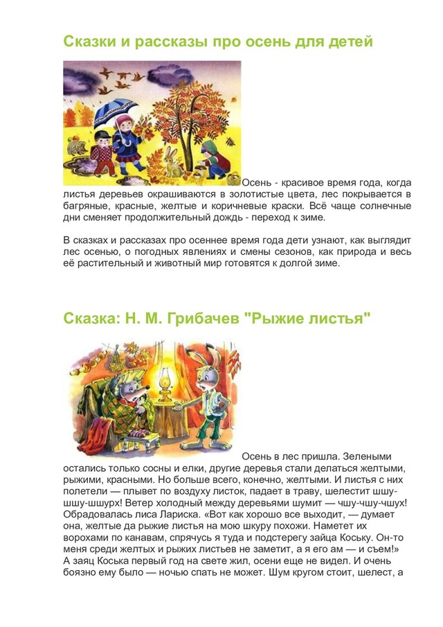 в темноту, глаза лапами продирает, а все ничего не видать. Утром встал, холодной водой глаза промыл. «Пойду-ка я, — решил он, похожу поброжу, с ежом Кирюхой поговорю. Он четвертый год на свете живет, может, расскажет что-нибудь». Пришел он к дому ежа, в дверь постучал — никто не отвечает, в окно постучал — тоже никто не отвечает. «Может, заболел еж Кирюха? — подумал заяц Коська. — Может, ему „скорая помощь― нужна? Придется без приглашения заходить». Зашел в сени — нет никого. Зашел на кухню — нет никого. Отыскался еж Кирюха в самой дальней комнате, где и окон нету. — Что это у тебя, еж Кирюха, так темно и сыро? — удивился заяц Коська. Может, заболел ты? — О-оах! — зевнул еж Кирюха. — Ничего я не заболел, а просто спать хочу. — Так ведь спать ночью надо, а сейчас утро! — Ничего ты не понимаешь, — сказал еж Кирюха и опять зевнул. — Осень вон пришла, за ней зима со снегом и морозом. А мы, ежи, всю зиму спим. Ни есть нам, ни пить не надо, спим — и все. Так что ты иди по своим делам, а я устраиваться буду. Весной приходи, может, чего расскажешь. «Ну, и ленивый этот еж Кирюха, — подумал заяц Коська. — Это ж надо — всю зиму спать! Бока, наверное, болеть будут. Пойду к медведю Потапу, может, он чего посоветует». Медведь Потап около берлоги лежал. Голова на лапах, глаза закрыты. Поздоровался с ним заяц Коська раз — не слышит медведь; поздоровался второй опять не слышит. Тогда чуть не в ухо крикнул: — Здравствуй, медведь Потап! Открыл медведь один глаз наполовину, спросил сонным голосом: — Это кто тут шумит? — Да я это, заяц Коська! — А чего тебе надо? Я спать хочу. — Так ведь спят ночью, а сейчас утро! — Ничего ты не понимаешь, — добродушно проворчал медведь Потап, удивляясь, что заяц не знает таких простых вещей. — Мы, медведи, как зима наступает, все время спим. Я мороза и снега не люблю, у меня лапы мерзнут. — Ох, помрешь ты от голода, медведь Потап! — Не помру, я под шубой знаешь сколько жира запас? До теплых дней хватит. Ты ко мне весной приходи, новости расскажешь. А сейчас ступай, только вон в углу лыжи стоят — себе их возьми. В прошлом году я их Мишутке сделал, да теперь он вырос, малы они ему. — Да зачем мне лыжи? — удивился заяц Коська. — Я на них и ходить не умею. — Ты бери, бери, зима придет — научишься. Ни лиса, ни волк тебя не догонят. А ко мне весной забегай, поговорим-умм! И опять закрыл медведь глаза, дремать стал. А заяц Коська хоть и не