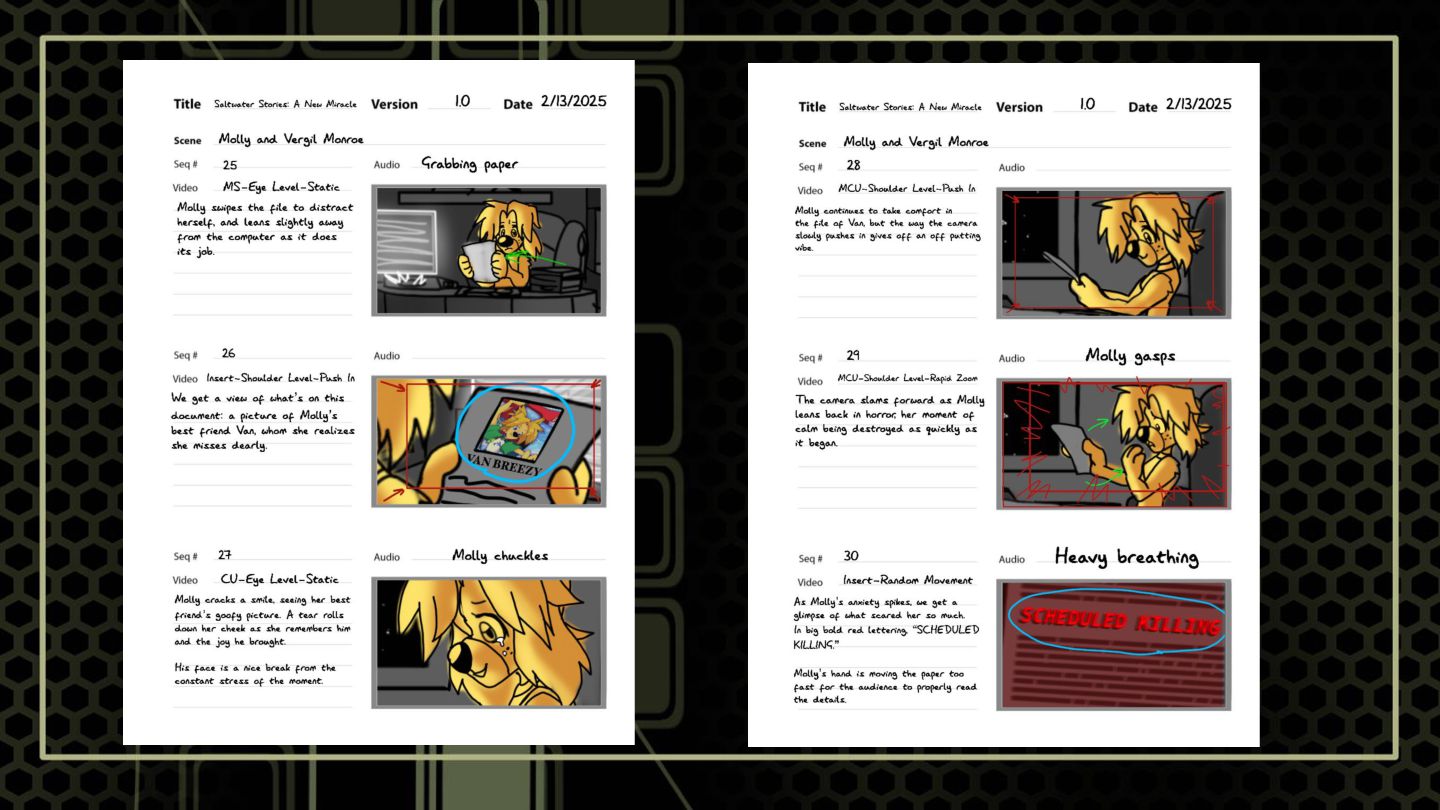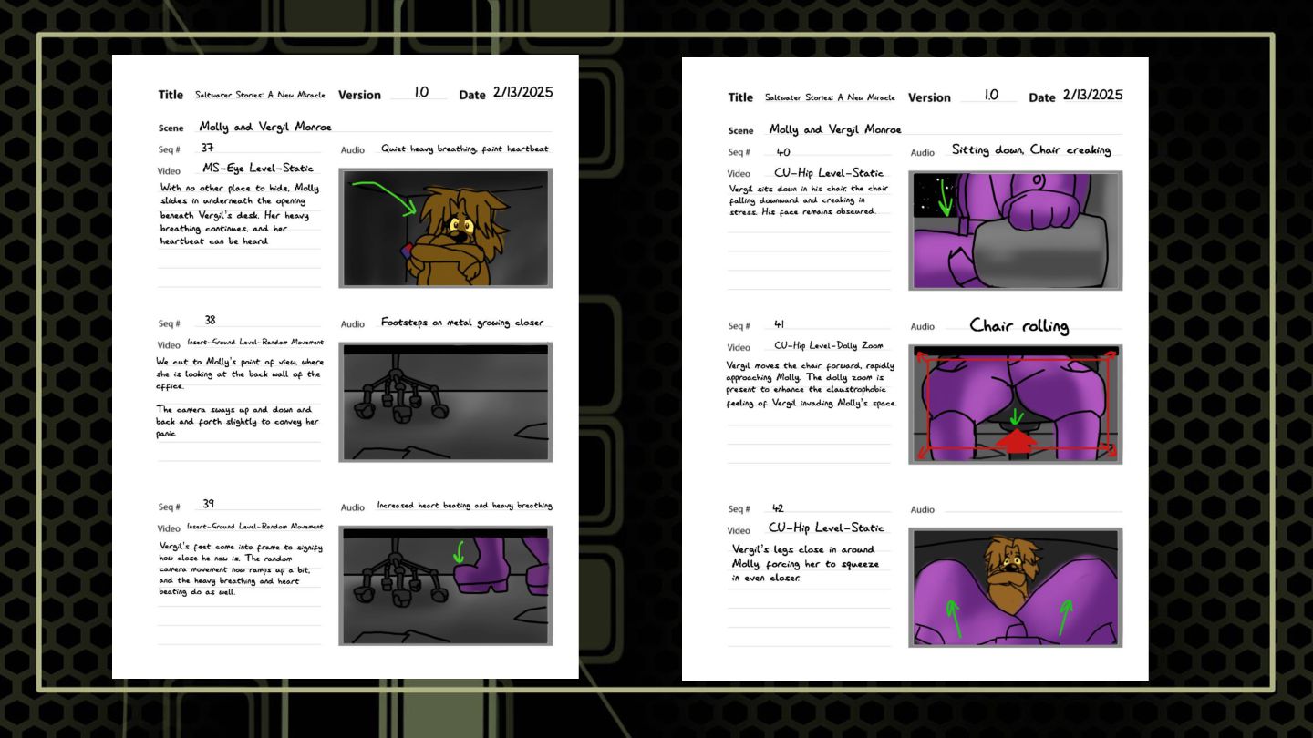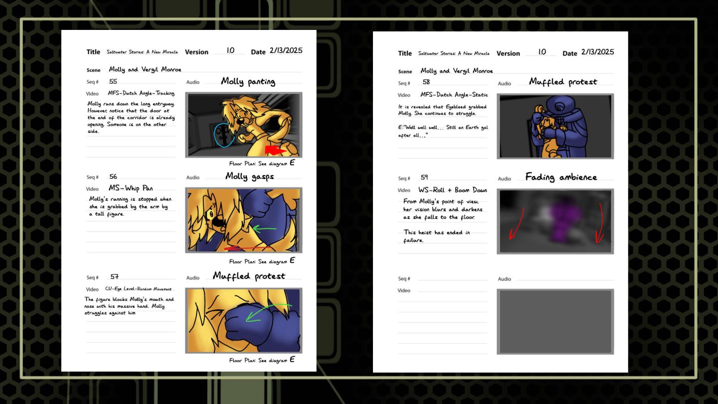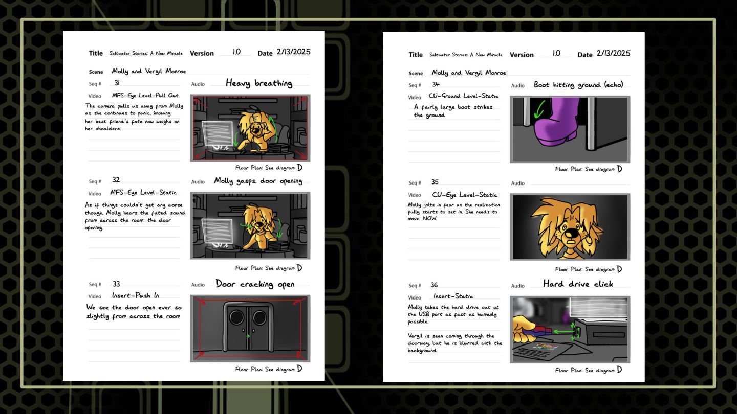 A sequence that features a character snooping around where she shouldn't to build suspense. These boards focus on highlighting anxious tendencies that build under a sense of looming danger, as well as elements of shock.