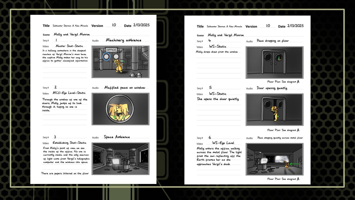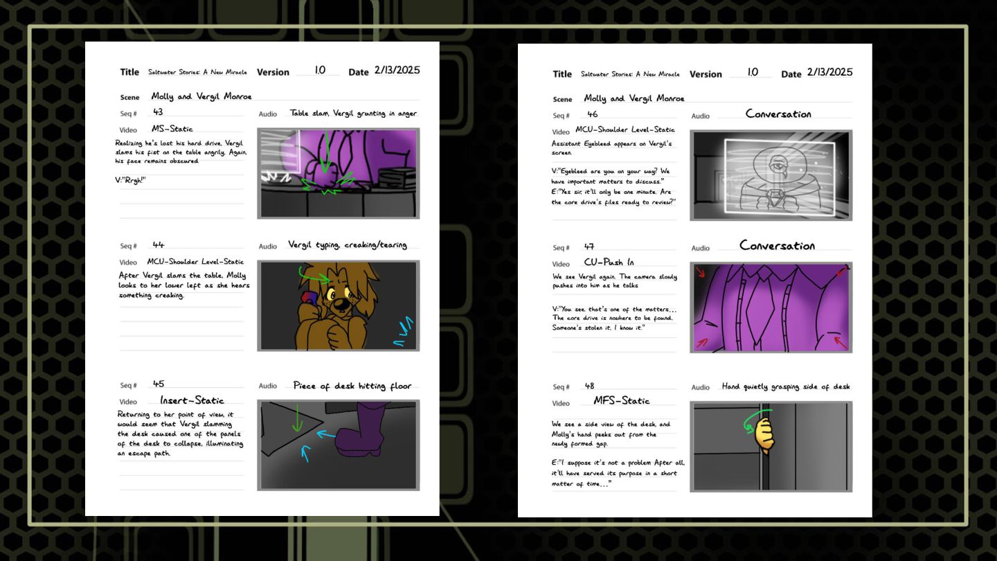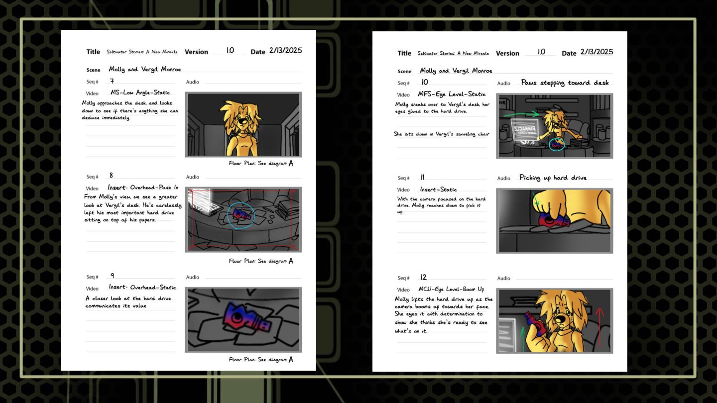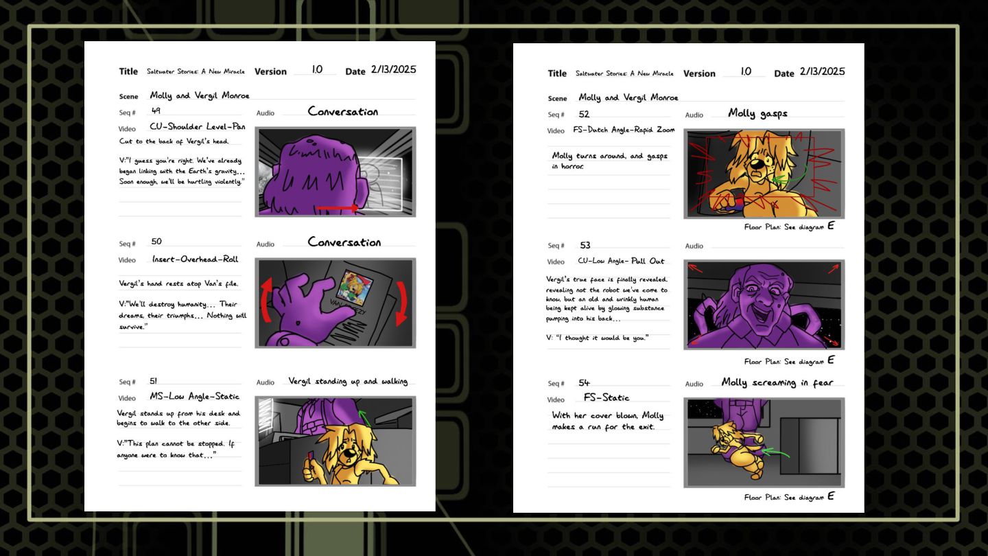 A sequence that features a character snooping around where she shouldn't to build suspense. These boards focus on highlighting anxious tendencies that build under a sense of looming danger, as well as elements of shock.