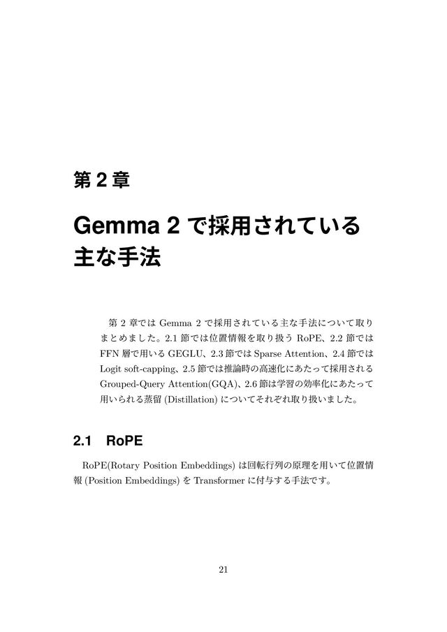 Θ,n = cos mθ1 − sin mθ1 sin mθ1 cos mθ1 T cos nθ1 − sin nθ1 sin nθ1 cos nθ1 = cos mθ1 sin mθ1 − sin mθ1 cos mθ1 cos nθ1 − sin nθ1 sin nθ1 cos nθ1 = cos mθ1 cos nθ1 + sin mθ1 sin nθ1 − cos mθ1 sin nθ1 + sin mθ1 cos nθ1 − sin mθ1 cos nθ1 + cos mθ1 sin nθ1 sin mθ1 sin nθ1 + cos mθ1 cos nθ1 = cos nθ1 cos mθ1 + sin nθ1 sin mθ1 −(sin nθ1 cos mθ1 − cos nθ1 sin mθ1) sin nθ1 cos mθ1 − cos nθ1 sin mθ1 cos nθ1 cos mθ1 + sin nθ1 sin mθ1 = cos (n − m)θ1 − sin (n − m)θ1 sin (n − m)θ1 cos (n − m)θ1 = Rd Θ,n−m 2.1.3 RoPE ͷਤࣜԽ RoPE ͷࣜਤ 2.2 ͷΑ͏ʹਤࣜԽ͞Ε·͢ɻ ˛ਤ 2.2 RoPE ͷਤࣜԽ (RoPE จ Figure 1) ਤ 2.2 ͷཧղʹ͋ͨͬͯɺ ʮ֤τʔΫϯͷࢄදݱͷཁૉΛ 2 ͭͣͭऔ 27