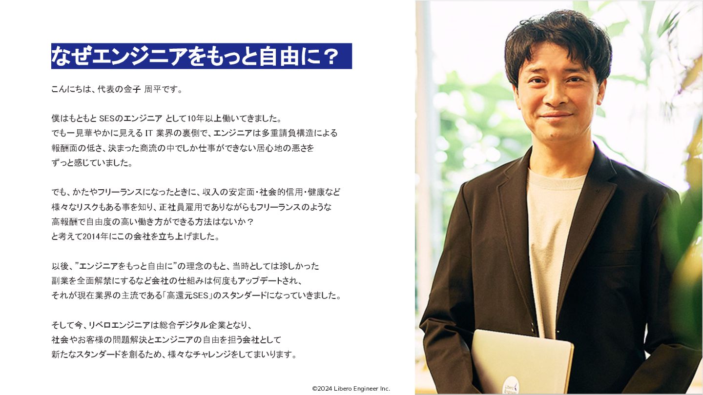 僕はもともと SESのエンジニア として10年以上働いてきました。 でも一見華やかに見える IT 業界の裏側で、エンジニアは多重請負構造による 報酬面の低さ、決まった商流の中でしか仕事ができない居心地の悪さを ずっと感じていました。 でも、かたやフリーランスになったときに、収入の安定面・社会的信用・健康など 様々なリスクもある事を知り、正社員雇用でありながらもフリーランスのような 高報酬で自由度の高い働き方ができる方法はないか? と考えて2014年にこの会社を立ち上げました。 以後、”エンジニアをもっと自由に”の理念のもと、当時としては珍しかった 副業を全面解禁にするなど会社の仕組みは何度もアップデートされ、 それが現在業界の主流である「高還元SES」のスタンダードになっていきました。 そして今、リベロエンジニアは総合デジタル企業となり、 社会やお客様の問題解決とエンジニアの自由を担う会社として 新たなスタンダードを創るため、様々なチャレンジをしてまいります。