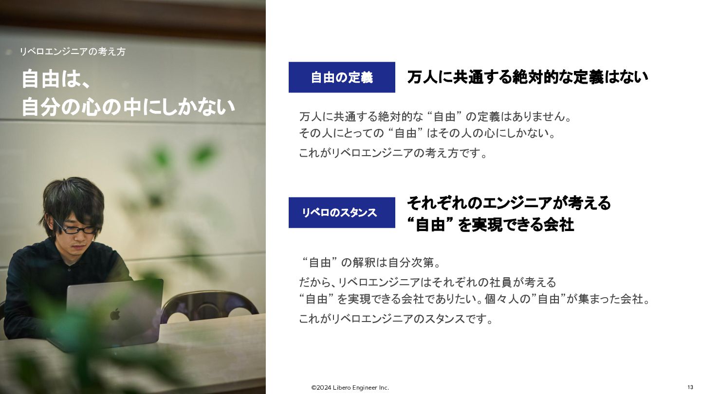 ©2024 Libero Engineer Inc. 13 自由は、 自分の心の中にしかない 自由の定義 リベロのスタンス