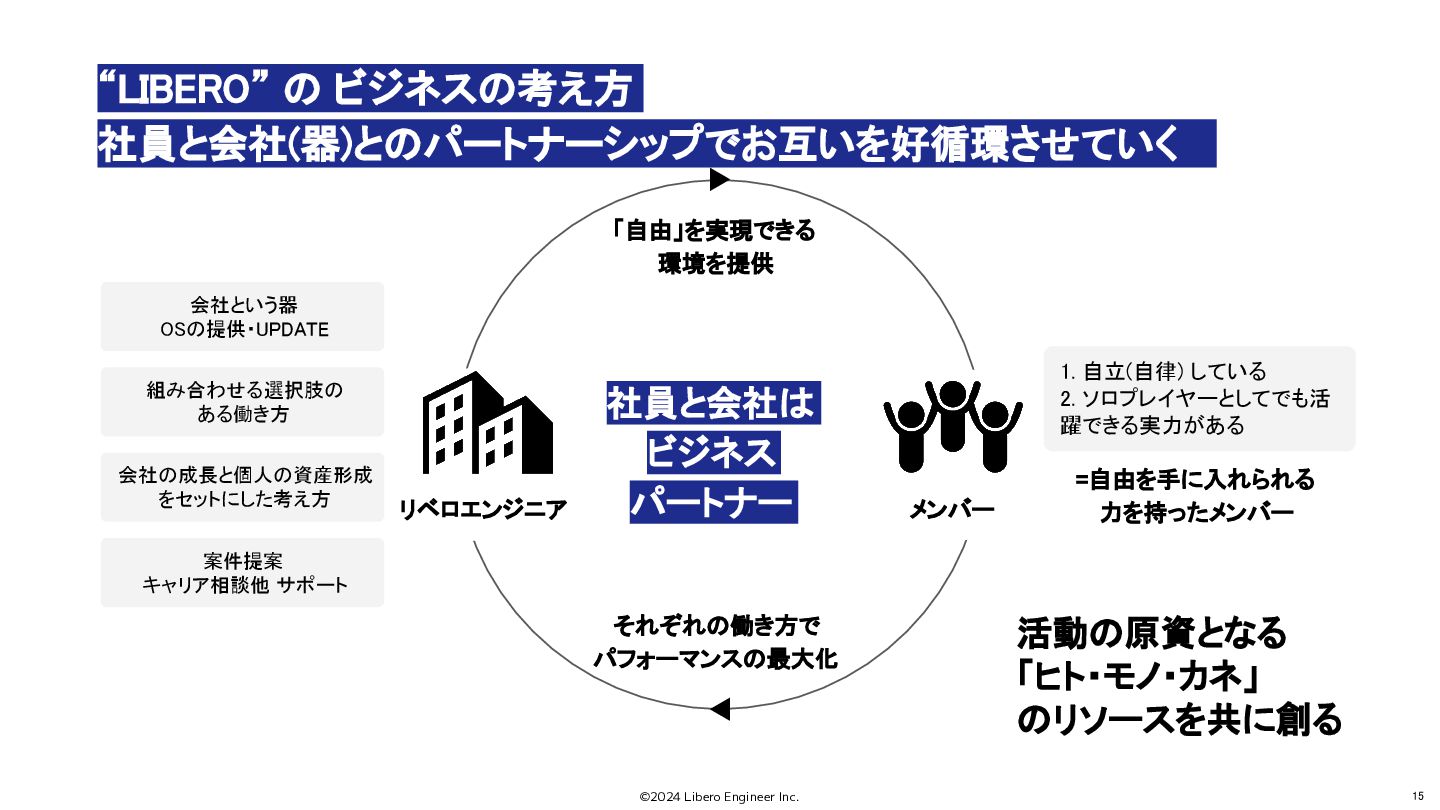 会社という器 OSの提供・UPDATE 組み合わせる選択肢の ある働き方 会社の成長と個人の資産形成 をセットにした考え方 案件提案 キャリア相談他 サポート 1. 自立(自律) している 2. ソロプレイヤーとしてでも活 躍できる実力がある 「自由」を実現できる 環境を提供 =自由を手に入れられる 力を持ったメンバー “LIBERO” の ビジネスの考え方 社員と会社(器)とのパートナーシップでお互いを好循環させていく リベロエンジニア 社員と会社は ビジネス パートナー 活動の原資となる 「ヒト・モノ・カネ」 のリソースを共に創る