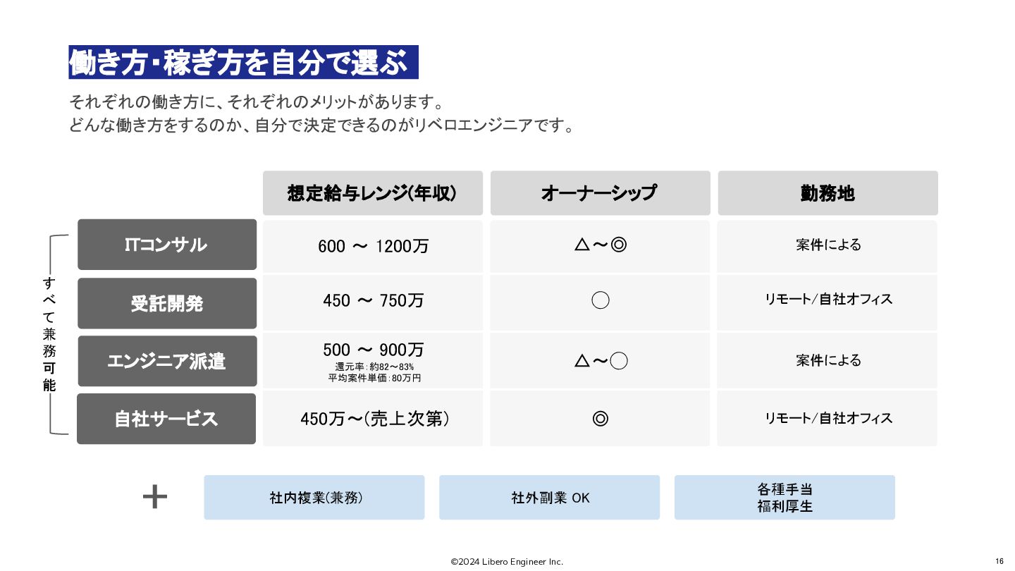 可 能 エンジニア派遣 受託開発 ITコンサル 自社サービス 想定給与レンジ(年収) オーナーシップ 勤務地 600 〜 1200万 450 〜 750万 500 〜 900万 還元率:約82〜83% 平均案件単価:80万円 450万〜(売上次第) ◯ △〜◯ ◎ 案件による リモート/自社オフィス 案件による リモート/自社オフィス △〜◎ 社内複業(兼務) + 社外副業 OK 各種手当 福利厚生 働き方・稼ぎ方を自分で選ぶ それぞれの働き方に、それぞれのメリットがあります。 どんな働き方をするのか、自分で決定できるのがリベロエンジニアです。