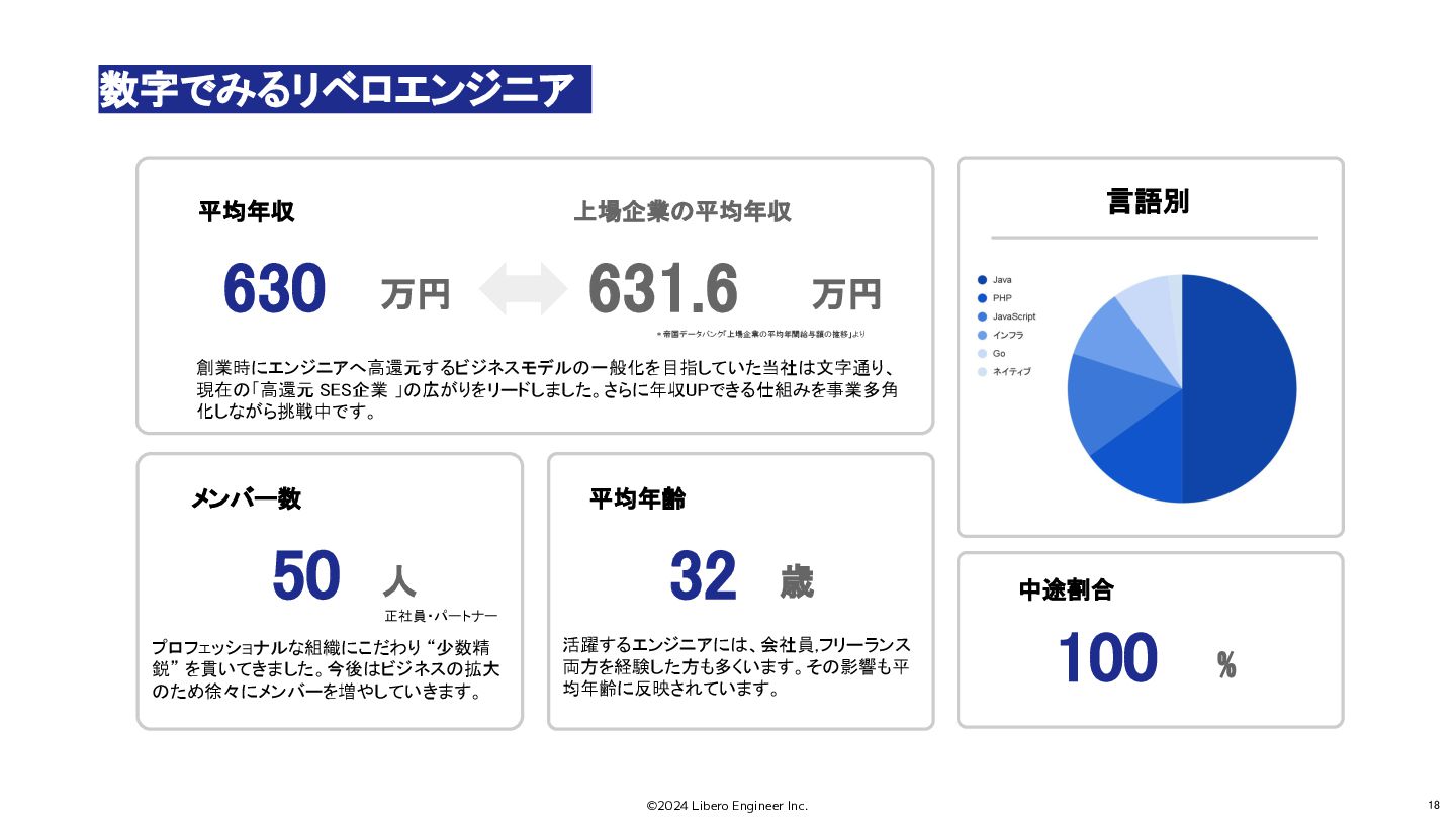 」の広がりをリードしました。さらに年収UPできる仕組みを事業多角 化しながら挑戦中です。 メンバー数 50 人 プロフェッショナルな組織にこだわり “少数精 鋭” を貫いてきました。今後はビジネスの拡大 のため徐々にメンバーを増やしていきます。 平均年齢 32 歳 活躍するエンジニアには、会社員,フリーランス 両方を経験した方も多くいます。その影響も平 均年齢に反映されています。 言語別 中途割合 100 % 万円 数字でみるリベロエンジニア 上場企業の平均年収 631.6 万円 *帝国データバンク「上場企業の平均年間給与額の推移」より 正社員・パートナー