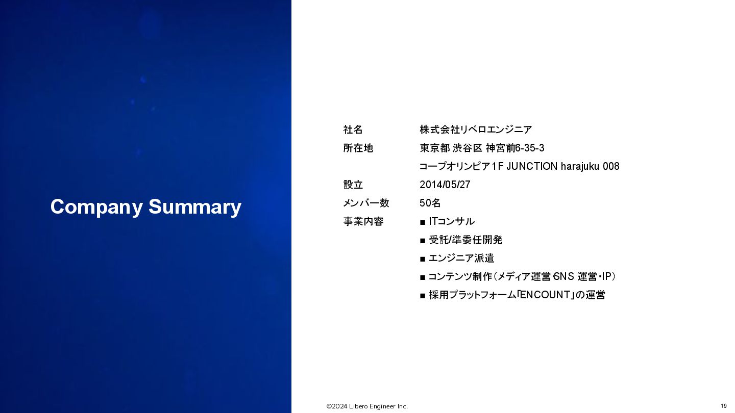 ©2024 Libero Engineer Inc. 19 Company Summary 社名 所在地 設立