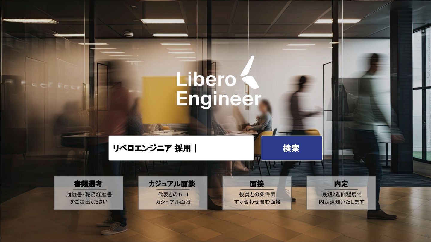 履歴書・職務経歴書 をご提出ください 代表との1on1 カジュアル面談 役員との条件面 すり合わせ含む面接 最短2週間程度で 内定通知いたします リベロエンジニア 採用| 検索 20