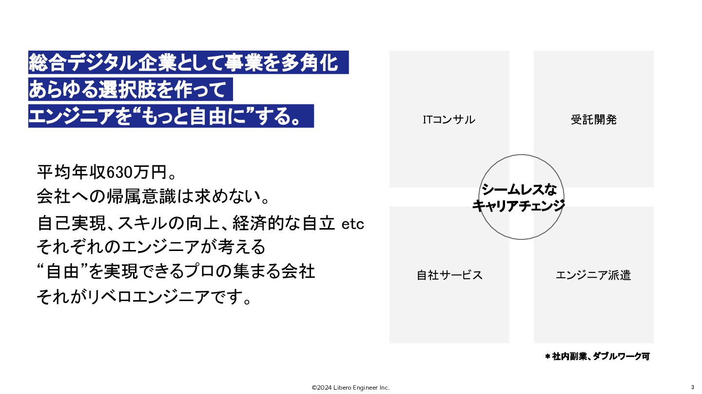 ©2024 Libero Engineer Inc. 3 総合デジタル企業として事業を多角化 あらゆる選択肢を作って エンジニアを“もっと自由に”する。