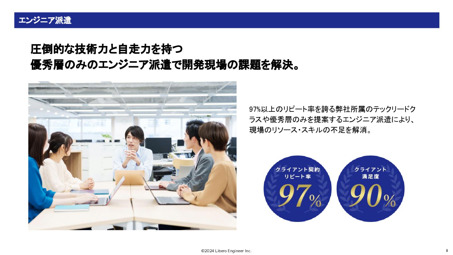 ©2024 Libero Engineer Inc. 8 圧倒的な技術力と自走力を持つ 優秀層のみのエンジニア派遣で開発現場の課題を解決。 エンジニア派遣