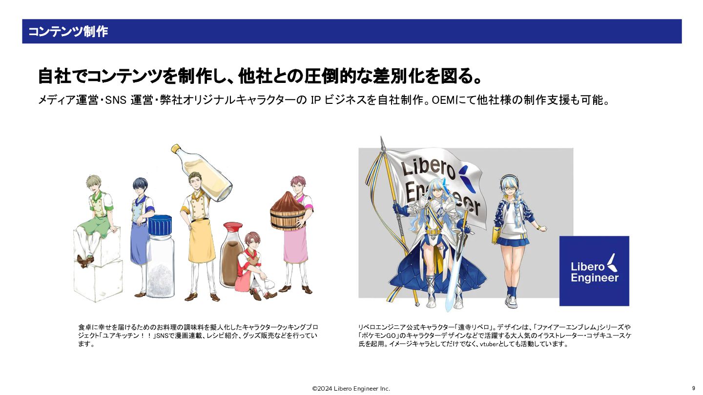 ©2024 Libero Engineer Inc. 9 メディア運営・SNS 運営・弊社オリジナルキャラクターの IP ビジネスを自社制作。OEMにて他社様の制作支援も可能。 食卓に幸せを届けるためのお料理の調味料を擬人化したキャラクタークッキングプロ