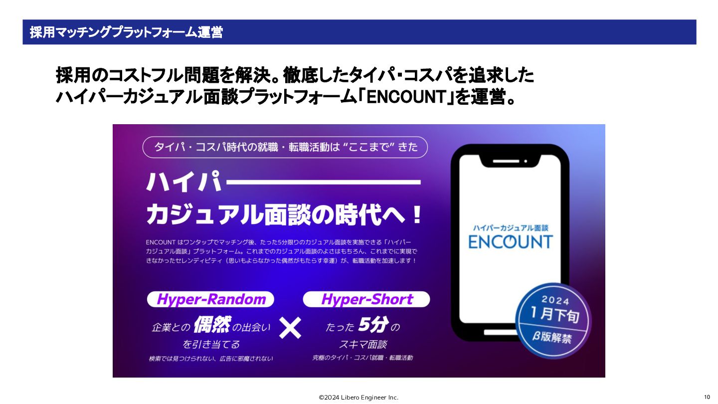 ©2024 Libero Engineer Inc. 10 採用マッチングプラットフォーム運営 採用のコストフル問題を解決。徹底したタイパ・コスパを追求した ハイパーカジュアル面談プラットフォーム「ENCOUNT」を運営。