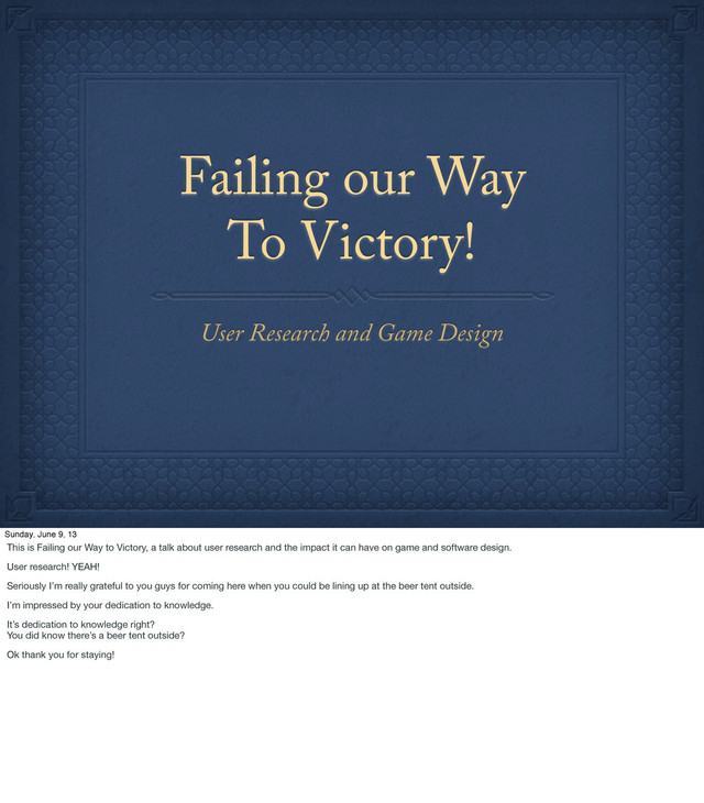Sunday, June 9, 13 This is Failing our Way to Victory, a talk about user research and the impact it can have on game and software design. User research! YEAH! Seriously I’m really grateful to you guys for coming here when you could be lining up at the beer tent outside. I’m impressed by your dedication to knowledge. It’s dedication to knowledge right? You did know there’s a beer tent outside? Ok thank you for staying!