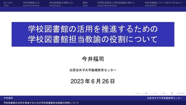 2023年6月26日に某自治体で行った学校図書館担当教諭の研修会で使用したスライドです。クリエイティブコモンズライセンス「表示 4.0 国際 (CC BY 4.0)」の条件で提供します。https://creativecommons.org/licenses/by/4.0/deed.ja