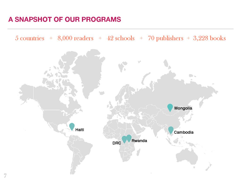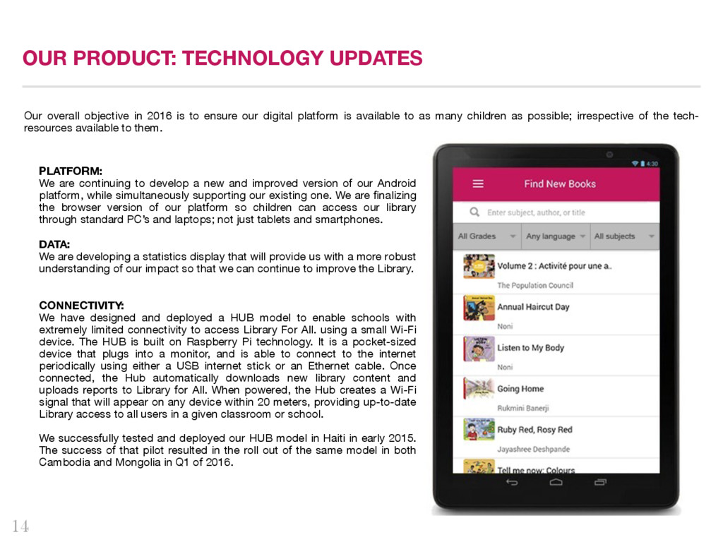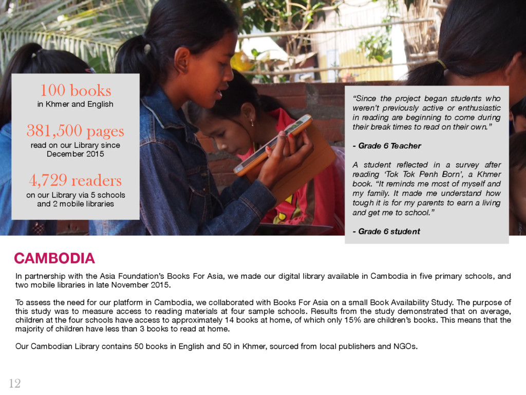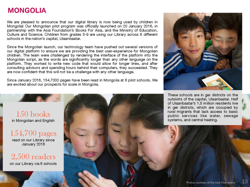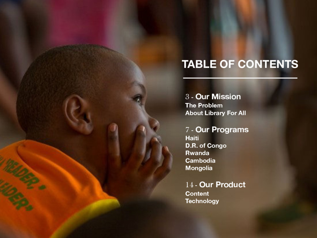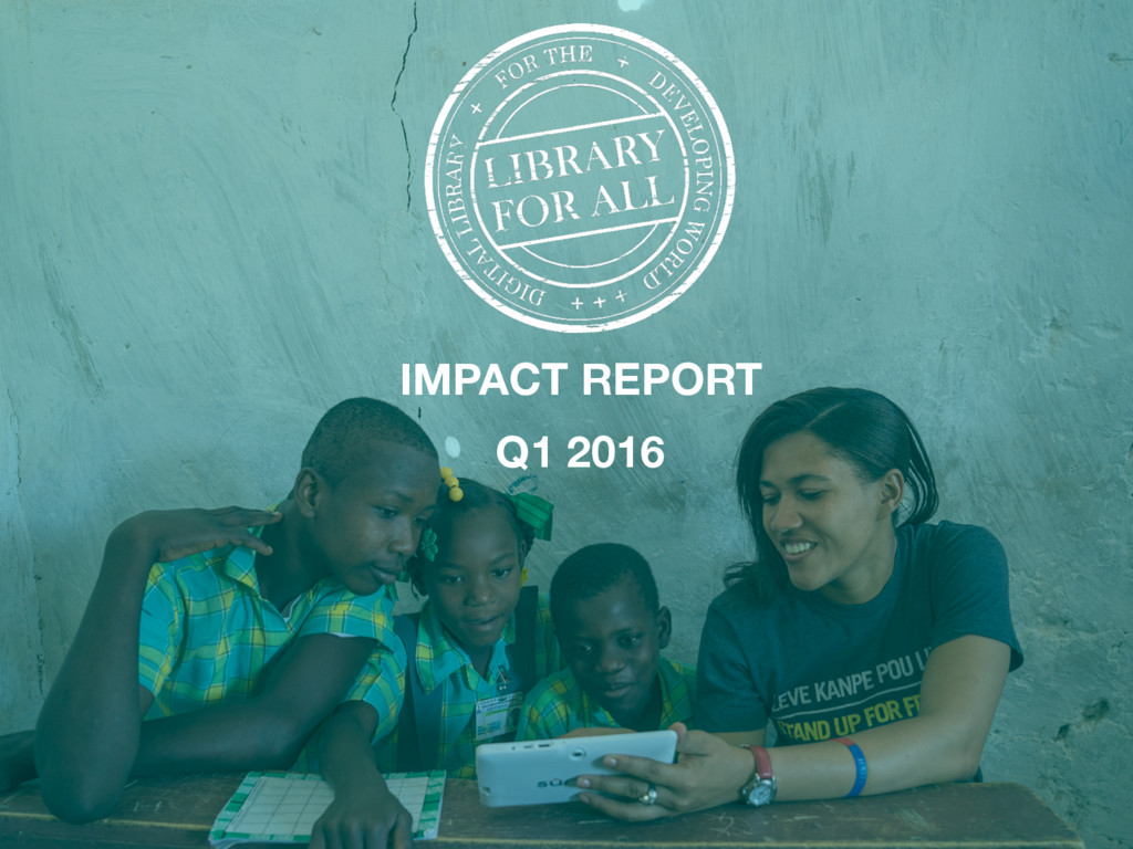 first Quarterly Impact Report! We are delighted to share this report with you, our dedicated supporters, partners, advisors, and peers. Library For All saw tremendous growth this quarter and achieved major milestones. In the following pages, you will see a snapshot of each of our current Library programs, including updates from our latest pilot program in Mongolia, user stories from our programs in Haiti, Rwanda, Democratic Republic and Cambodia, and our plans for the months ahead. As we hope this report demonstrates, in Q1 of 2016, we have continued to test new ideas, pilot different models and push the boundaries. We have encouraged our team not to fear failure, but rather to fail fast so that we can then find new paths forward. We are excited by the progress we have made in Q1 and the strategies we have put in place to deepen and widen our impact in Q2, and we hope you are too. We wish you happy reading! Rebecca McDonald, Founder and CEO Tanyella Evans, Co-Founder and COO