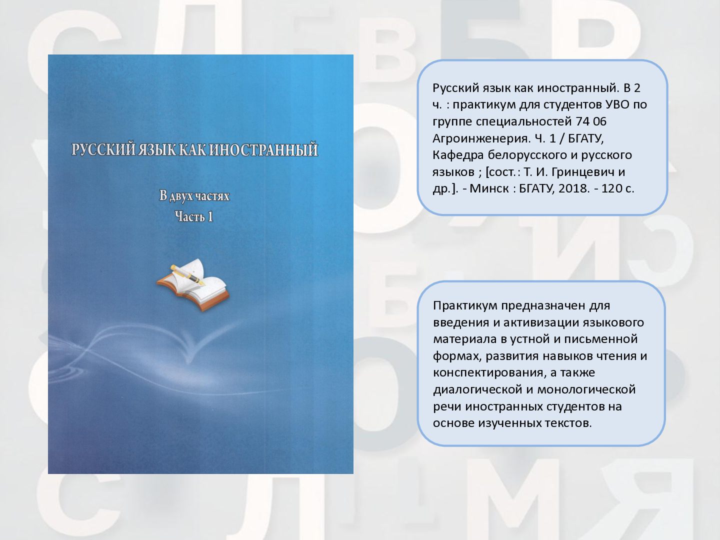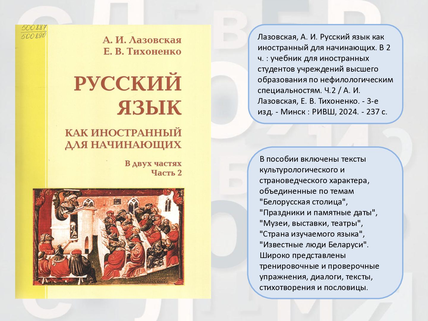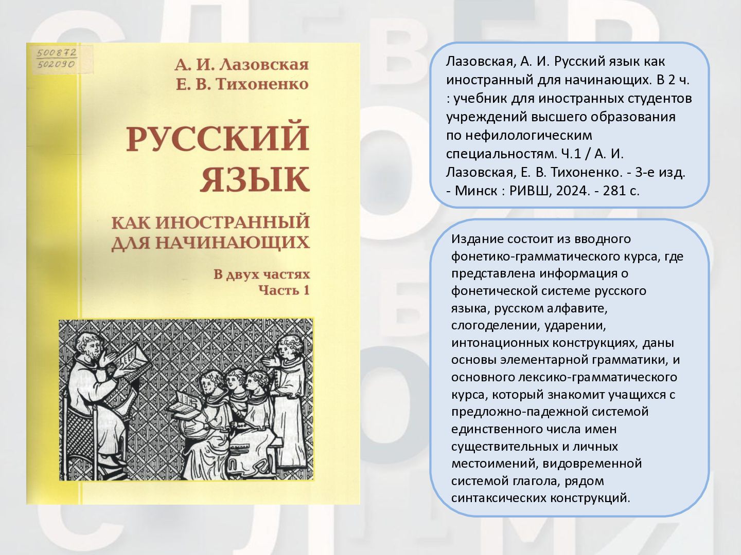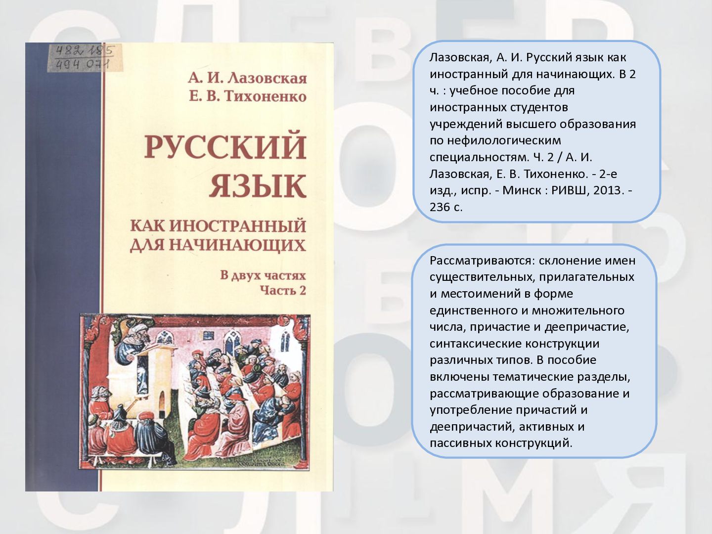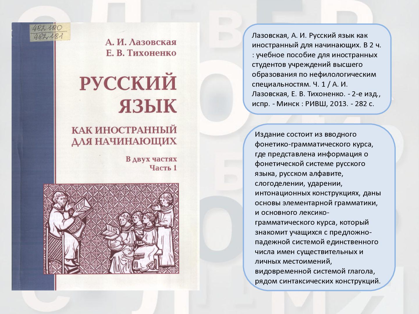 2 ч. : учебное пособие для иностранных студентов учреждений высшего образования по нефилологическим специальностям. Ч. 1 / А. И. Лазовская, Е. В. Тихоненко. - 2-е изд., испр. - Минск : РИВШ, 2013. - 282 c. Издание состоит из вводного фонетико-грамматического курса, где представлена информация о фонетической системе русского языка, русском алфавите, слогоделении, ударении, интонационных конструкциях, даны основы элементарной грамматики, и основного лексико- грамматического курса, который знакомит учащихся с предложно- падежной системой единственного числа имен существительных и личных местоимений, видовременной системой глагола, рядом синтаксических конструкций.