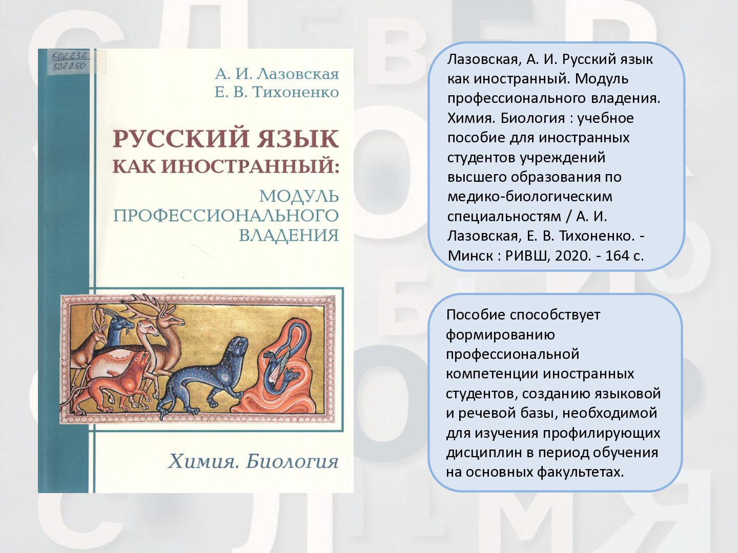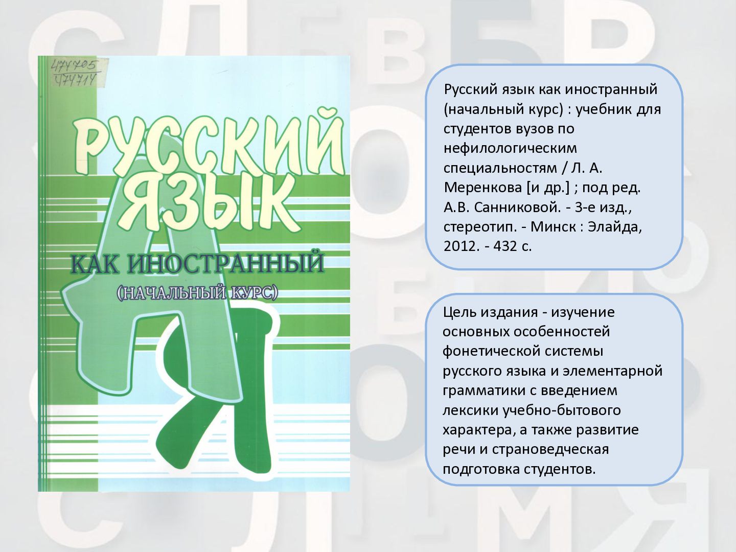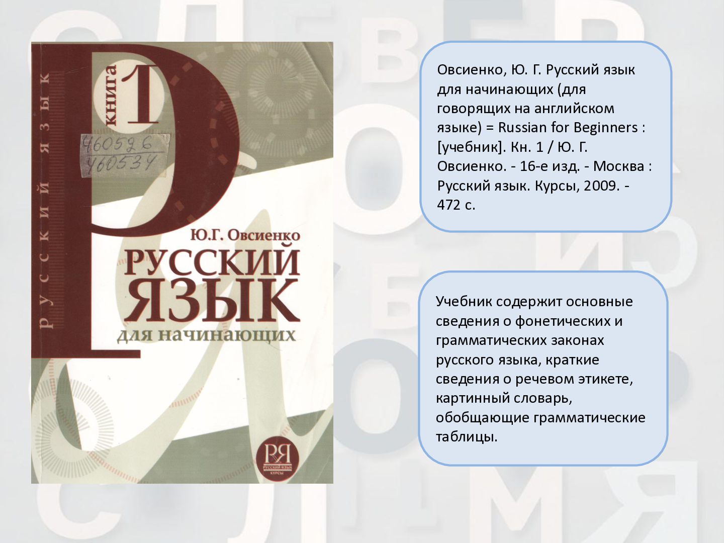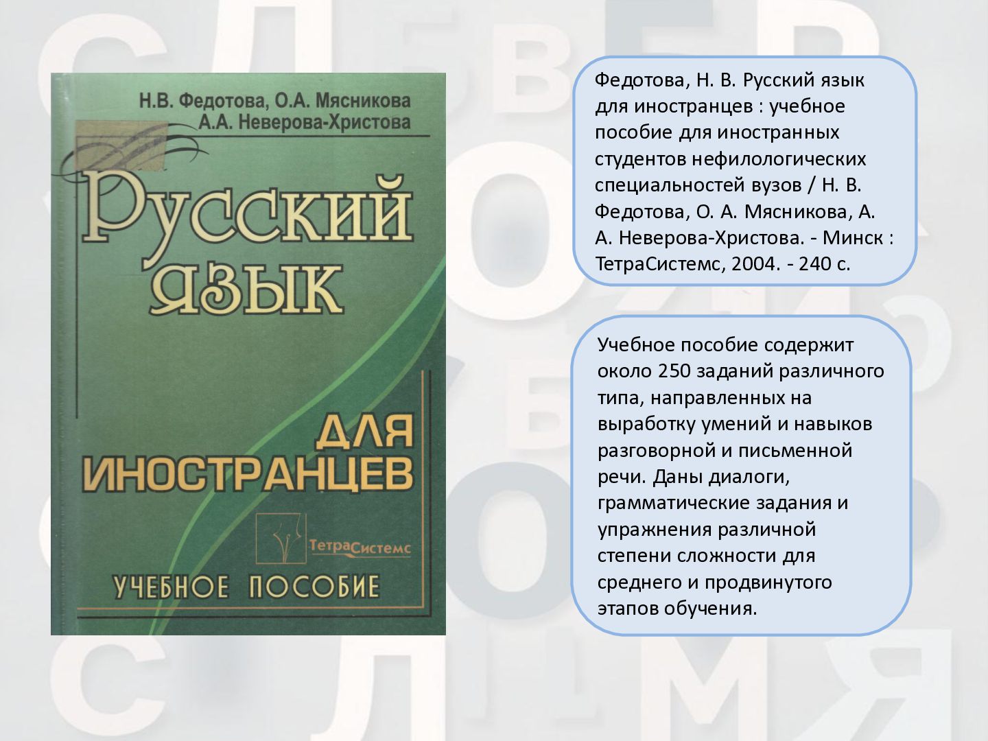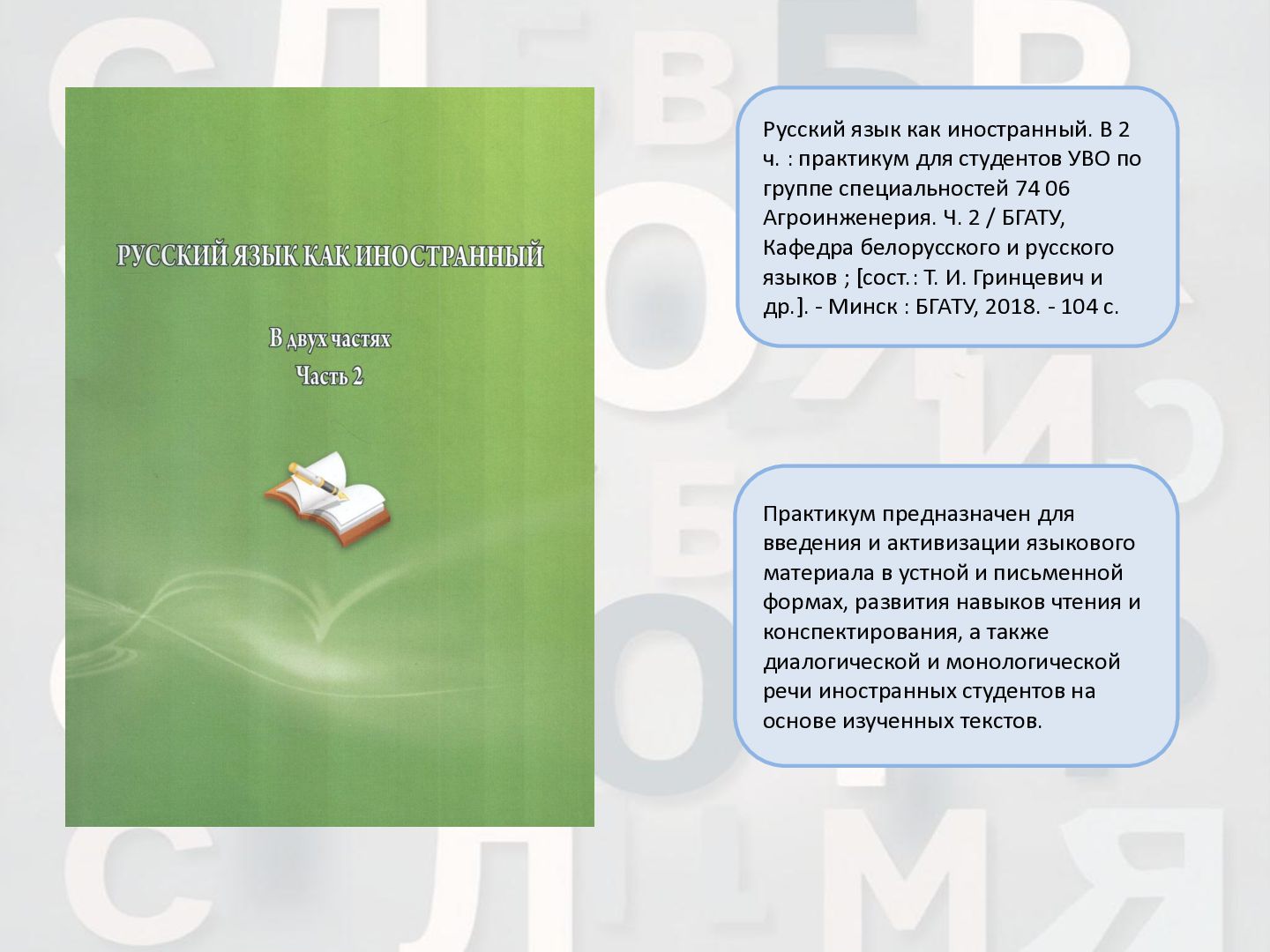 2 ч. : учебное пособие для иностранных студентов учреждений высшего образования по нефилологическим специальностям. Ч. 1 / А. И. Лазовская, Е. В. Тихоненко. - 2-е изд., испр. - Минск : РИВШ, 2013. - 282 c. Издание состоит из вводного фонетико-грамматического курса, где представлена информация о фонетической системе русского языка, русском алфавите, слогоделении, ударении, интонационных конструкциях, даны основы элементарной грамматики, и основного лексико- грамматического курса, который знакомит учащихся с предложно- падежной системой единственного числа имен существительных и личных местоимений, видовременной системой глагола, рядом синтаксических конструкций.