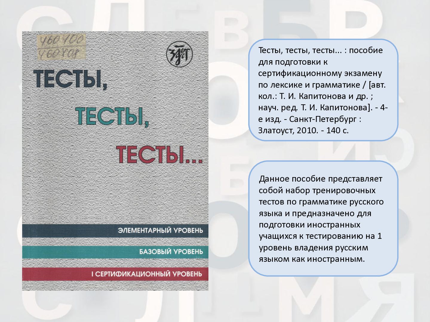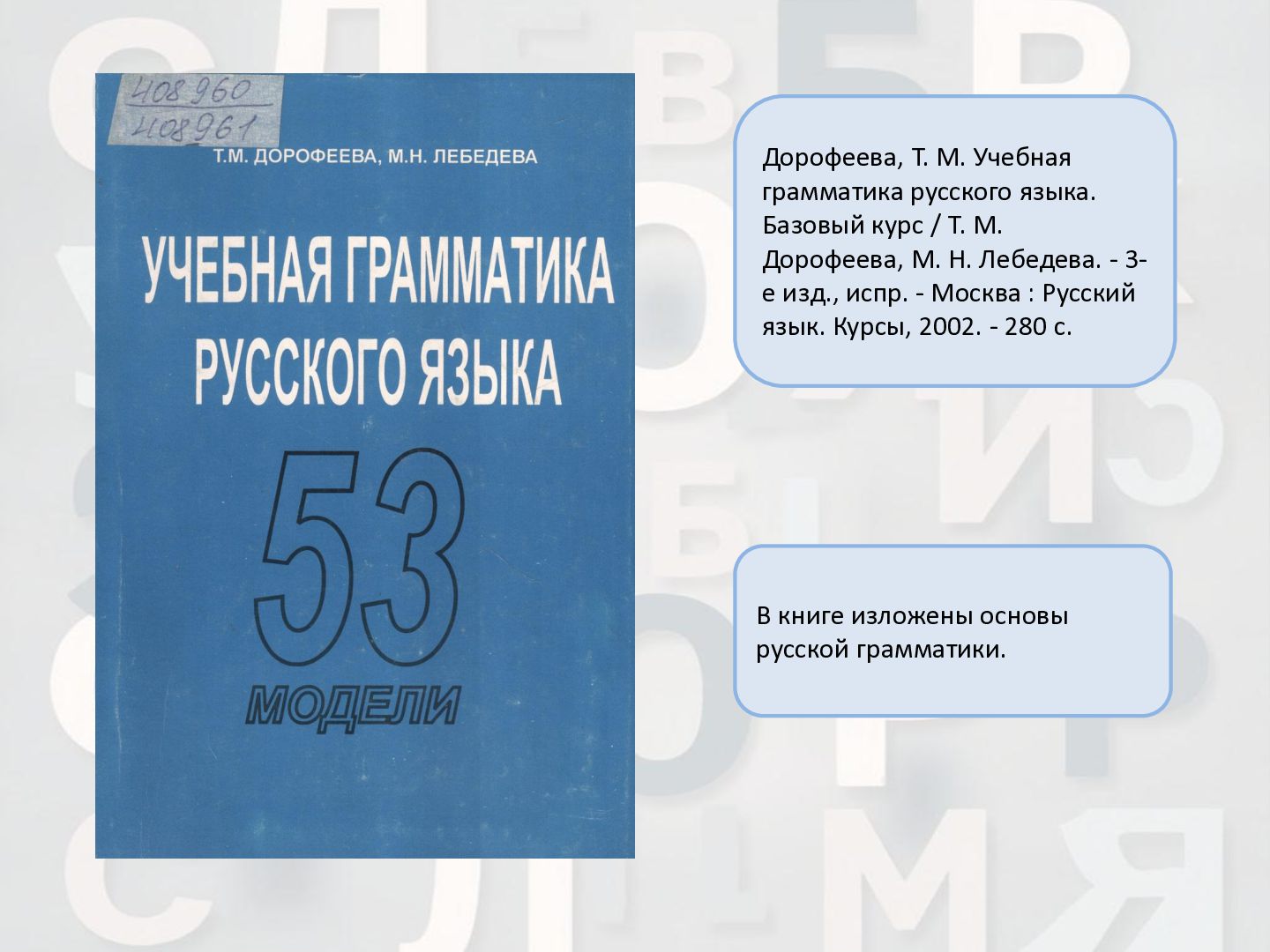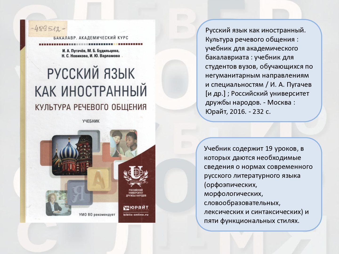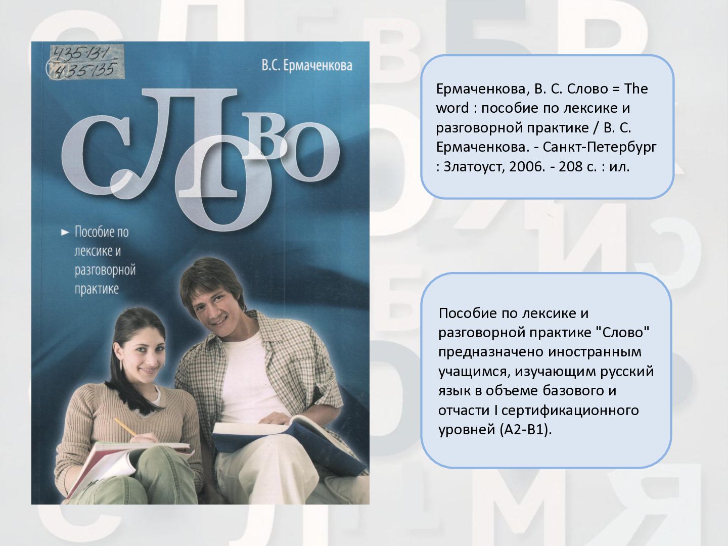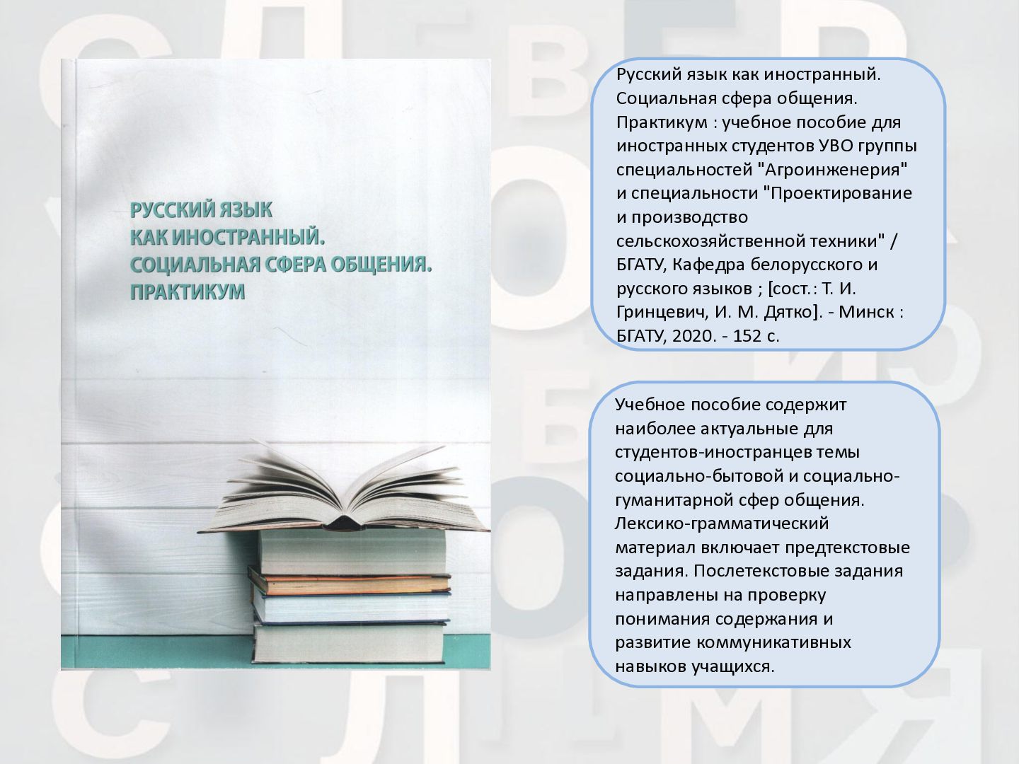 2 ч. : учебное пособие для иностранных студентов учреждений высшего образования по нефилологическим специальностям. Ч. 1 / А. И. Лазовская, Е. В. Тихоненко. - 2-е изд., испр. - Минск : РИВШ, 2013. - 282 c. Издание состоит из вводного фонетико-грамматического курса, где представлена информация о фонетической системе русского языка, русском алфавите, слогоделении, ударении, интонационных конструкциях, даны основы элементарной грамматики, и основного лексико- грамматического курса, который знакомит учащихся с предложно- падежной системой единственного числа имен существительных и личных местоимений, видовременной системой глагола, рядом синтаксических конструкций.