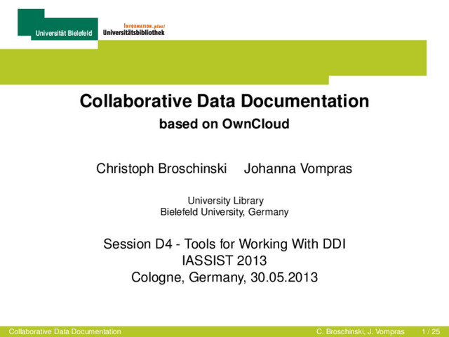 Johanna Vompras University Library Bielefeld University, Germany Session D4 - Tools for Working With DDI IASSIST 2013 Cologne, Germany, 30.05.2013 Collaborative Data Documentation C. Broschinski, J. Vompras 1 / 25