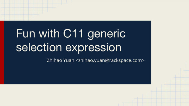 _Generic(a, int: 1); Clang: _Generic("moew", char[5]: 1); _Generic(a, const int: 1); auto& lr = i; _Generic(lr, const int: 1); Implications In the rest of the talk, Clang's semantics is used.