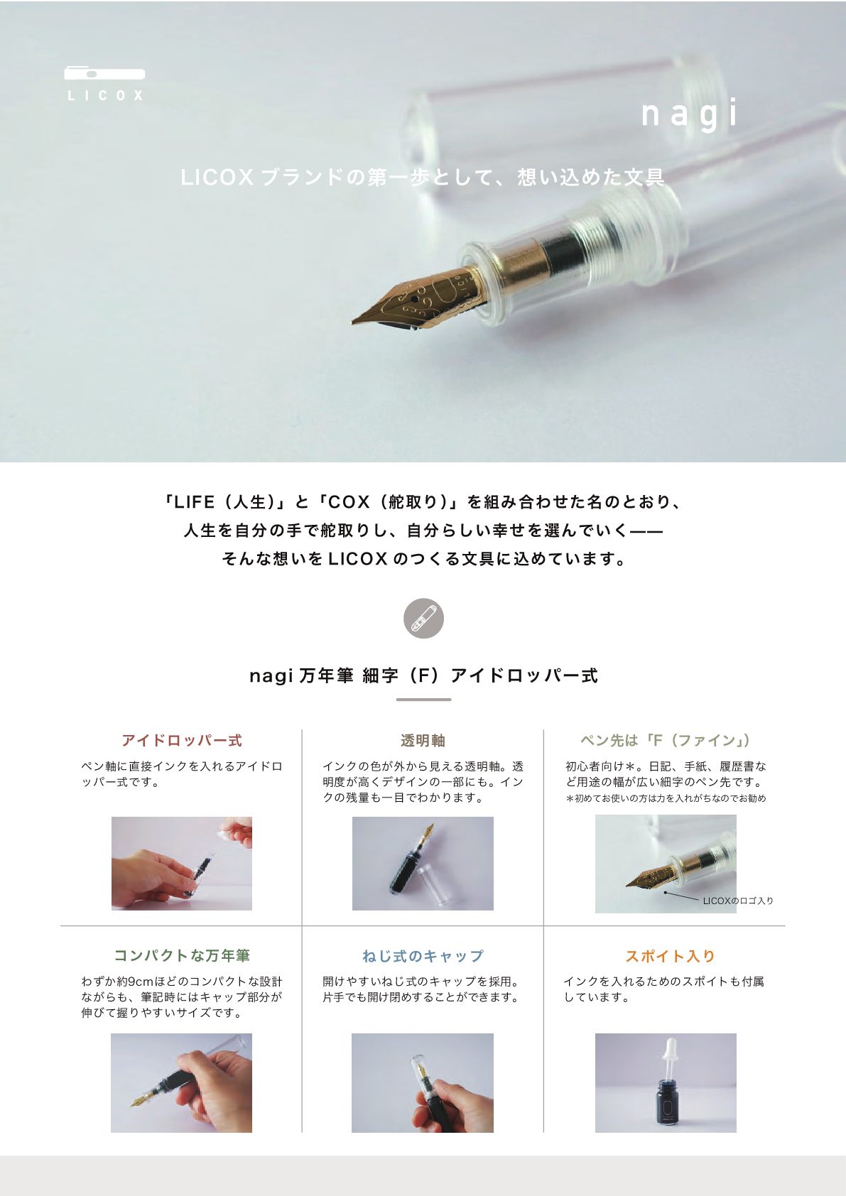ສ೥චࡉࣈʢ'ʣΞΠυϩούʔࣜ ಁ໌࣠ ϖϯઌ͸ʮ'ʢϑΝΠϯʯ ʣ Ͷࣜ͡ͷΩϟοϓ εϙΠτೖΓ ΠϯΫͷ৭͕֎͔Βݟ͑Δಁ໌࣠ɻಁ ໌౓͕ߴ͘σβΠϯͷҰ෦ʹ΋ɻΠϯ Ϋͷ࢒ྔ΋Ұ໨ͰΘ͔Γ·͢ɻ ։͚΍͍͢Ͷࣜ͡ͷΩϟοϓΛ࠾༻ɻ ยखͰ΋։͚ดΊ͢Δ͜ͱ͕Ͱ͖·͢ɻ ίϯύΫτͳສ೥ච Θ͔ͣ໿DN΄ͲͷίϯύΫτͳઃܭ ͳ͕Β΋ɺචه࣌ʹ͸Ωϟοϓ෦෼͕ ৳ͼͯѲΓ΍͍͢αΠζͰ͢ɻ ΠϯΫΛೖΕΔͨΊͷεϙΠτ΋෇ଐ ͍ͯ͠·͢ɻ ΞΠυϩούʔࣜ ϖϯ࣠ʹ௚઀ΠϯΫΛೖΕΔΞΠυϩ ούʔࣜͰ͢ɻ ॳ৺ऀ޲͚ˎɻ೔هɺखࢴɺཤྺॻͳ Ͳ༻్ͷ෯͕޿͍ࡉࣈͷϖϯઌͰ͢ɻ ˎॳΊ͓ͯ࢖͍ͷํ͸ྗΛೖΕ͕ͪͳͷͰ͓קΊ -*$09ͷϩΰೖΓ