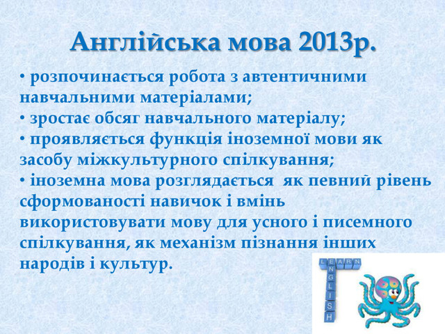 • зростає обсяг навчального матеріалу; • проявляється функція іноземної мови як засобу міжкультурного спілкування; • іноземна мова розглядається як певний рівень сформованості навичок і вмінь використовувати мову для усного і писемного спілкування, як механізм пізнання інших народів і культур.