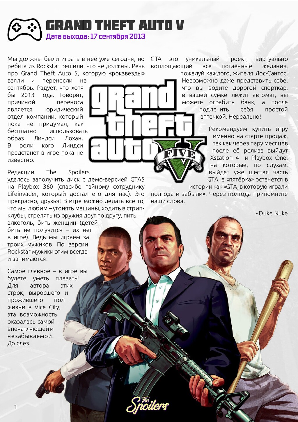 должны были играть в неё уже сегодня, но ребята из Rockstar решили, что не должны. Речь про Grand Theft Auto 5, которую «рокзвёзды» взяли и перенесли на сентябрь. Радует, что хотя бы 2013 года. Говорят, причиной переноса является юридический отдел компании, который пока не придумал, как бесплатно использовать образ Линдси Лохан. В роли кого Линдси предстанет в игре пока не известно. Редакции The Spoilers удалось заполучить диск с демо-версией GTA5 на Playbox 360 (спасибо тайному сотруднику Lifeinvader, который достал его для нас). Это прекрасно, друзья! В игре можно делать всё то, что мы любим – угонять машины, ходить в стрип- клубы, стрелять из оружия друг по другу, пить алкоголь, бить женщин (детей бить не получится – их нет в игре). Ведь мы играем за троих мужиков. По версии Rockstar мужики этим всегда и занимаются. Самое главное – в игре вы будете уметь плавать! Для автора этих строк, выросшего и прожившего пол жизни в Vice City, эта возможность оказалась самой впечатляющей и незабываемой. До слёз. GTA это уникальный проект, виртуально воплощающий все потаённые желания, пожалуй каждого, жителя Лос-Сантос. Невозможно даже представить себе, что вы водите дорогой спорткар, в вашей сумке лежит автомат, вы можете ограбить банк, а после подлечить себя простой аптечкой. Нереально! Рекомендуем купить игру именно на старте продаж, так как через пару месяцев после её релиза выйдут Xstation 4 и Playbox One, на которые, по слухам, выйдет уже шестая часть GTA, а «пятёрка» останется в истории как «GTA, в которую играли полгода и забыли». Через полгода припомните наши слова. - Duke Nuke 1