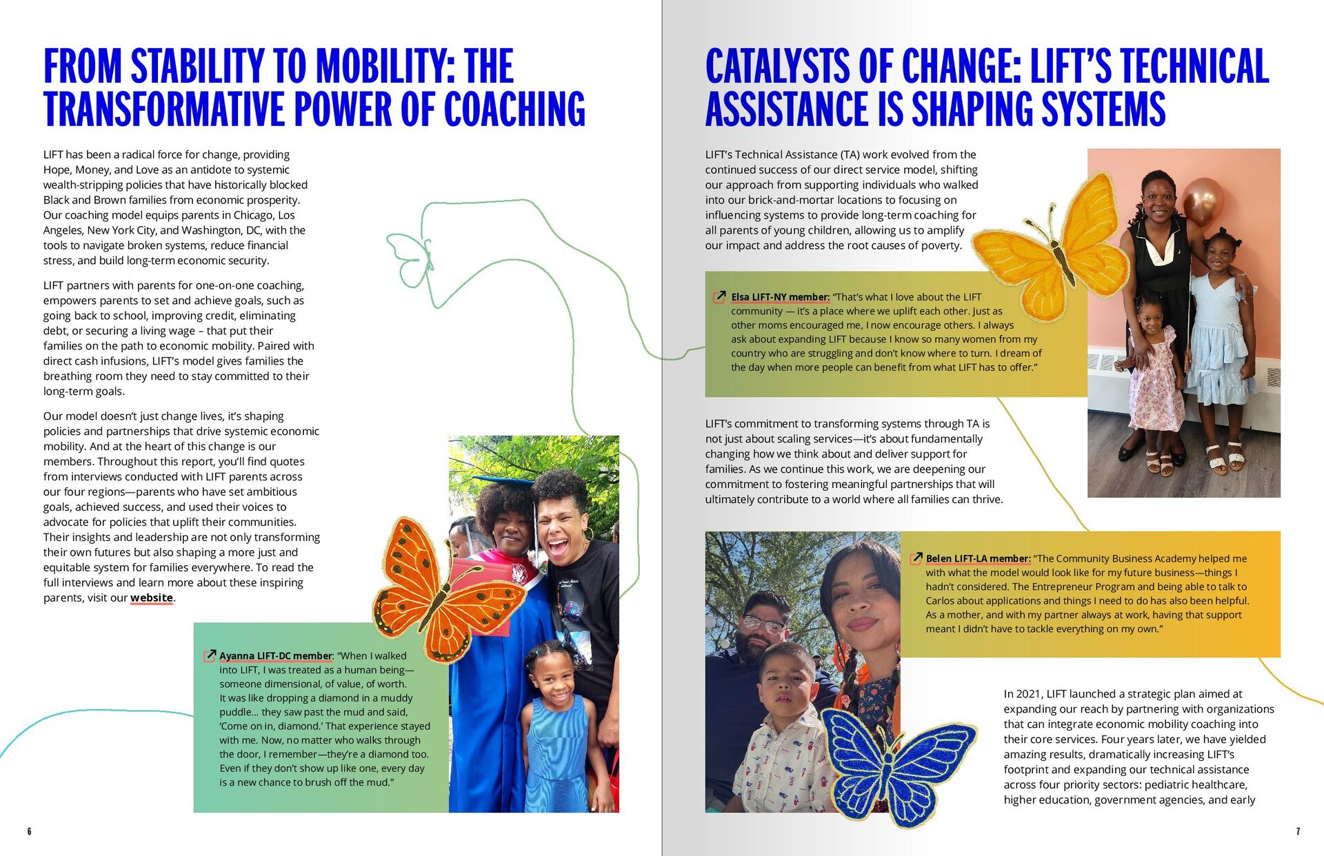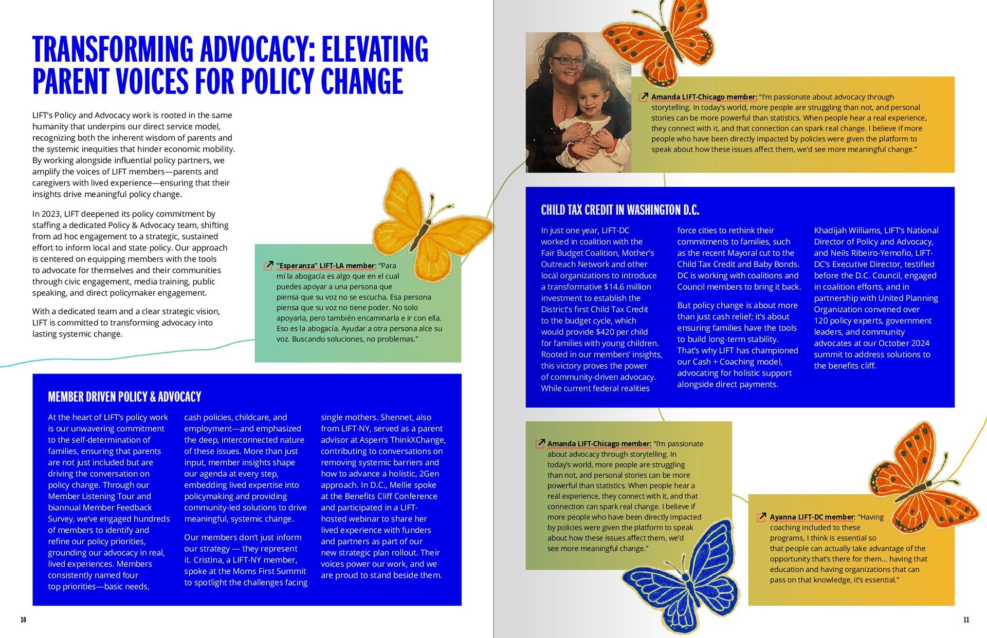 LIFT’s Policy and Advocacy work is rooted in the same humanity that underpins our direct service model, recognizing both the inherent wisdom of parents and the systemic inequities that hinder economic mobility. By working alongside influential policy partners, we amplify the voices of LIFT members—parents and caregivers with lived experience—ensuring that their insights drive meaningful policy change. In 2023, LIFT deepened its policy commitment by staffing a dedicated Policy & Advocacy team, shifting from ad hoc engagement to a strategic, sustained effort to inform local and state policy. Our approach is centered on equipping members with the tools to advocate for themselves and their communities through civic engagement, media training, public speaking, and direct policymaker engagement. With a dedicated team and a clear strategic vision, LIFT is committed to transforming advocacy into lasting systemic change. At the heart of LIFT’s policy work is our unwavering commitment to the self-determination of families, ensuring that parents are not just included but are driving the conversation on policy change. Through our Member Listening Tour and biannual Member Feedback Survey, we’ve engaged hundreds of members to identify and refine our policy priorities, grounding our advocacy in real, lived experiences. Members consistently named four top priorities—basic needs, cash policies, childcare, and employment—and emphasized the deep, interconnected nature of these issues. More than just input, member insights shape our agenda at every step, embedding lived expertise into policymaking and providing community-led solutions to drive meaningful, systemic change. Our members don’t just inform our strategy — they represent it. Cristina, a LIFT-NY member, spoke at the Moms First Summit to spotlight the challenges facing single mothers. Shennet, also from LIFT-NY, served as a parent advisor at Aspen’s ThinkXChange, contributing to conversations on removing systemic barriers and how to advance a holistic, 2Gen approach. In D.C., Mellie spoke at the Benefits Cliff Conference and participated in a LIFT- hosted webinar to share her lived experience with funders and partners as part of our new strategic plan rollout. Their voices power our work, and we are proud to stand beside them. In just one year, LIFT-DC worked in coalition with the Fair Budget Coalition, Mother’s Outreach Network and other local organizations to introduce a transformative $14.6 million investment to establish the District’s first Child Tax Credit to the budget cycle, which would provide $420 per child for families with young children. Rooted in our members’ insights, this victory proves the power of community-driven advocacy. While current federal realities force cities to rethink their commitments to families, such as the recent Mayoral cut to the Child Tax Credit and Baby Bonds. DC is working with coalitions and Council members to bring it back. But policy change is about more than just cash relief; it’s about ensuring families have the tools to build long-term stability. That’s why LIFT has championed our Cash + Coaching model, advocating for holistic support alongside direct payments. Khadijah Williams, LIFT’s National Director of Policy and Advocacy, and Neils Ribeiro-Yemofio, LIFT- DC’s Executive Director, testified before the D.C. Council, engaged in coalition efforts, and in partnership with United Planning Organization convened over 120 policy experts, government leaders, and community advocates at our October 2024 summit to address solutions to the benefits cliff. “Esperanza” LIFT-LA member: “Para mí la abogacía es algo que en el cual puedes apoyar a una persona que piensa que su voz no se escucha. Esa persona piensa que su voz no tiene poder. No solo apoyarla, pero también encaminarla e ir con ella. Eso es la abogacía. Ayudar a otra persona alce su voz. Buscando soluciones, no problemas.” Amanda LIFT-Chicago member: “I’m passionate about advocacy through storytelling. In today’s world, more people are struggling than not, and personal stories can be more powerful than statistics. When people hear a real experience, they connect with it, and that connection can spark real change. I believe if more people who have been directly impacted by policies were given the platform to speak about how these issues affect them, we’d see more meaningful change.” Amanda LIFT-Chicago member: “I’m passionate about advocacy through storytelling. In today’s world, more people are struggling than not, and personal stories can be more powerful than statistics. When people hear a real experience, they connect with it, and that connection can spark real change. I believe if more people who have been directly impacted by policies were given the platform to speak about how these issues affect them, we’d see more meaningful change.” Ayanna LIFT-DC member: “Having coaching included to these programs, I think is essential so that people can actually take advantage of the opportunity that’s there for them… having that education and having organizations that can pass on that knowledge, it’s essential.” MEMBER DRIVEN POLICY & ADVOCACY CHILD TAX CREDIT IN WASHINGTON D.C.