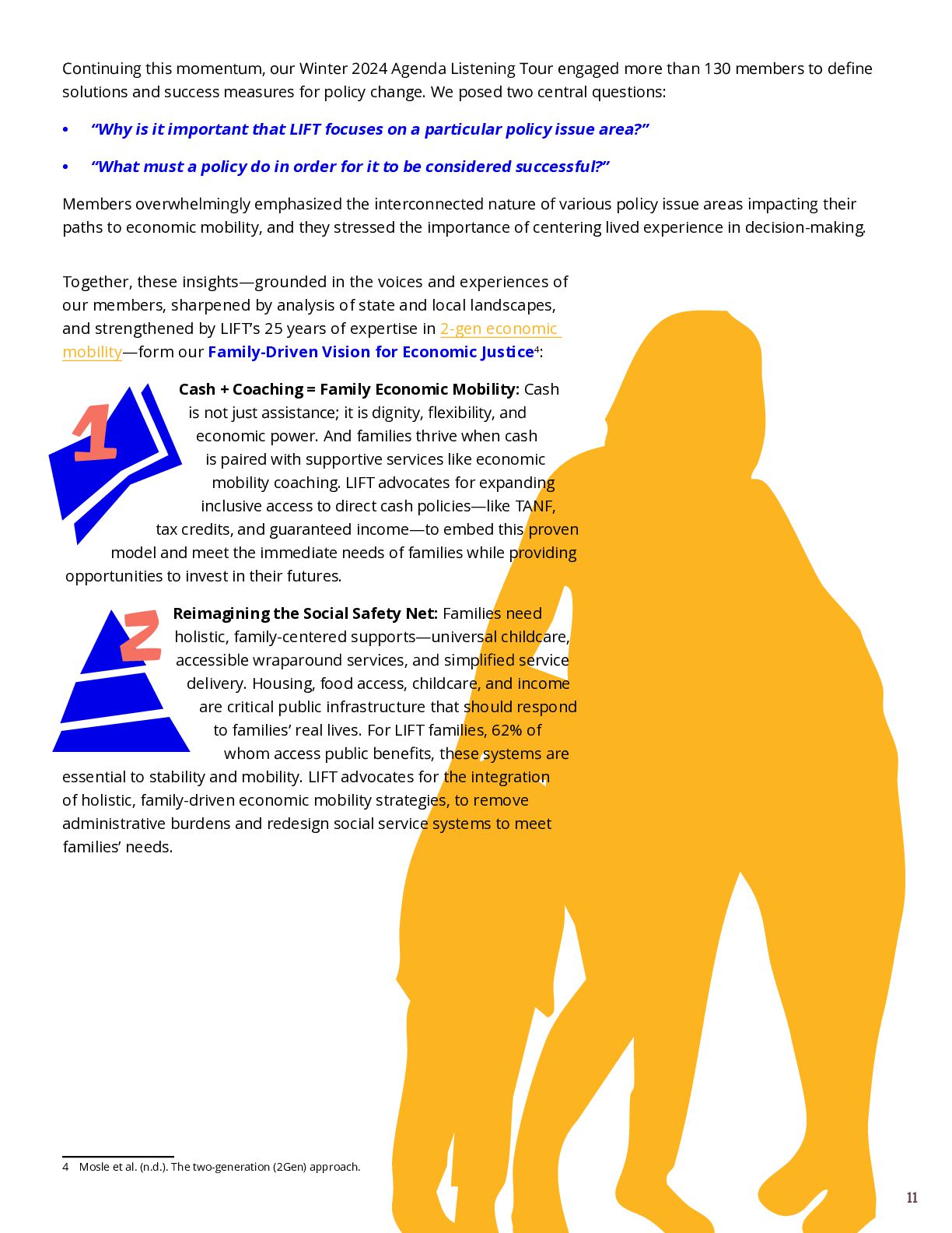 members, sharpened by analysis of state and local landscapes, and strengthened by LIFT’s 25 years of expertise in 2-gen economic mobility—form our Family-Driven Vision for Economic Justice4: Cash + Coaching = Family Economic Mobility: Cash is not just assistance; it is dignity, flexibility, and economic power. And families thrive when cash is paired with supportive services like economic mobility coaching. LIFT advocates for expanding inclusive access to direct cash policies—like TANF, tax credits, and guaranteed income—to embed this proven model and meet the immediate needs of families while providing opportunities to invest in their futures. Reimagining the Social Safety Net: Families need holistic, family-centered supports—universal childcare, accessible wraparound services, and simplified service delivery. Housing, food access, childcare, and income are critical public infrastructure that should respond to families’ real lives. For LIFT families, 62% of whom access public benefits, these systems are essential to stability and mobility. LIFT advocates for the integration of holistic, family-driven economic mobility strategies, to remove administrative burdens and redesign social service systems to meet families’ needs. 4 Mosle et al. (n.d.). The two-generation (2Gen) approach. Continuing this momentum, our Winter 2024 Agenda Listening Tour engaged more than 130 members to define solutions and success measures for policy change. We posed two central questions: • “Why is it important that LIFT focuses on a particular policy issue area?” • “What must a policy do in order for it to be considered successful?” Members overwhelmingly emphasized the interconnected nature of various policy issue areas impacting their paths to economic mobility, and they stressed the importance of centering lived experience in decision-making. 11