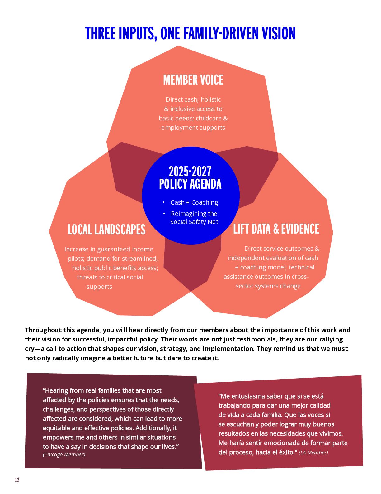 families that are most affected by the policies ensures that the needs, affected by the policies ensures that the needs, challenges, and perspectives of those directly challenges, and perspectives of those directly affected are considered, which can lead to more affected are considered, which can lead to more equitable and effective policies. Additionally, it equitable and effective policies. Additionally, it empowers me and others in similar situations empowers me and others in similar situations to have a say in decisions that shape our lives.” to have a say in decisions that shape our lives.” (Chicago Member) “Me entusiasma saber que si se está “Me entusiasma saber que si se está trabajando para dar una mejor calidad trabajando para dar una mejor calidad de vida a cada familia. Que las voces si de vida a cada familia. Que las voces si se escuchan y poder lograr muy buenos se escuchan y poder lograr muy buenos resultados en las necesidades que vivimos. resultados en las necesidades que vivimos. Me haría sentir emocionada de formar parte Me haría sentir emocionada de formar parte del proceso, hacia el éxito.” del proceso, hacia el éxito.” (LA Member) Throughout this agenda, you will hear directly from our members about the importance of this work and their vision for successful, impactful policy. Their words are not just testimonials, they are our rallying cry—a call to action that shapes our vision, strategy, and implementation. They remind us that we must not only radically imagine a better future but dare to create it. 2025-2027 POLICY AGENDA • Cash + Coaching • Reimagining the Social Safety Net THREE INPUTS, ONE FAMILY-DRIVEN VISION MEMBER VOICE Direct cash; holistic & inclusive access to basic needs; childcare & employment supports LIFT DATA & EVIDENCE Direct service outcomes & independent evaluation of cash + coaching model; technical assistance outcomes in cross- sector systems change LOCAL LANDSCAPES Increase in guaranteed income pilots; demand for streamlined, holistic public benefits access; threats to critical social supports 12