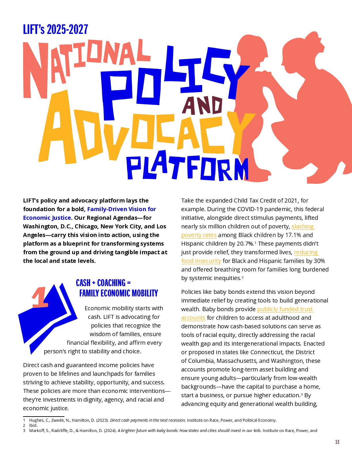 for a bold, Family-Driven Vision for Economic Justice. Our Regional Agendas—for Washington, D.C., Chicago, New York City, and Los Angeles—carry this vision into action, using the platform as a blueprint for transforming systems from the ground up and driving tangible impact at the local and state levels. CASH + COACHING = FAMILY ECONOMIC MOBILITY Economic mobility starts with cash. LIFT is advocating for policies that recognize the wisdom of families, ensure financial flexibility, and affirm every person’s right to stability and choice. Direct cash and guaranteed income policies have proven to be lifelines and launchpads for families striving to achieve stability, opportunity, and success. These policies are more than economic interventions— they’re investments in dignity, agency, and racial and economic justice. 1 Hughes, C., Zwede, N., Hamilton, D. (2023). Direct cash payments in the next recession. Institute on Race, Power, and Political Economy. 2 Ibid. 3 Markoff, S., Radcliffe, D., & Hamilton, D. (2024). A brighter future with baby bonds: How states and cities should invest in our kids. Institute on Race, Power, and Take the expanded Child Tax Credit of 2021, for example. During the COVID-19 pandemic, this federal initiative, alongside direct stimulus payments, lifted nearly six million children out of poverty, slashing poverty rates among Black children by 17.1% and Hispanic children by 20.7%.1 These payments didn’t just provide relief, they transformed lives, reducing food insecurity for Black and Hispanic families by 30% and offered breathing room for families long burdened by systemic inequities.2 Policies like baby bonds extend this vision beyond immediate relief by creating tools to build generational wealth. Baby bonds provide publicly funded trust accounts for children to access at adulthood and demonstrate how cash-based solutions can serve as tools of racial equity, directly addressing the racial wealth gap and its intergenerational impacts. Enacted or proposed in states like Connecticut, the District of Columbia, Massachusetts, and Washington, these accounts promote long-term asset building and ensure young adults—particularly from low-wealth backgrounds—have the capital to purchase a home, start a business, or pursue higher education.3 By advancing equity and generational wealth building, 13