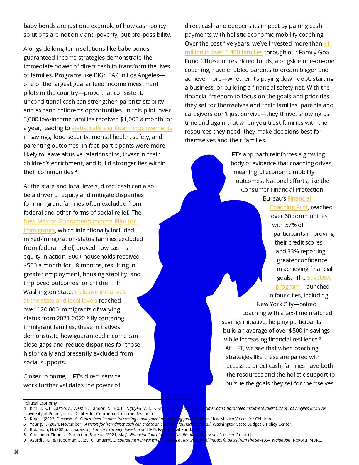 solutions are not only anti-poverty, but pro-possibility. Alongside long-term solutions like baby bonds, guaranteed income strategies demonstrate the immediate power of direct cash to transform the lives of families. Programs like BIG:LEAP in Los Angeles— one of the largest guaranteed income investment pilots in the country—prove that consistent, unconditional cash can strengthen parents’ stability and expand children’s opportunities. In this pilot, over 3,000 low-income families received $1,000 a month for a year, leading to statistically significant improvements in savings, food security, mental health, safety, and parenting outcomes. In fact, participants were more likely to leave abusive relationships, invest in their children’s enrichment, and build stronger ties within their communities.4 At the state and local levels, direct cash can also be a driver of equity and mitigate disparities for immigrant families often excluded from federal and other forms of social relief. The New Mexico Guaranteed Income Pilot for Immigrants, which intentionally included mixed-immigration-status families excluded from federal relief, proved how cash is equity in action: 300+ households received $500 a month for 18 months, resulting in greater employment, housing stability, and improved outcomes for children.5 In Washington State, inclusive initiatives at the state and local levels reached over 120,000 immigrants of varying status from 2021-2022.6 By centering immigrant families, these initiatives demonstrate how guaranteed income can close gaps and reduce disparities for those historically and presently excluded from social supports. Closer to home, LIFT’s direct service work further validates the power of Political Economy. 4 Kim, B.-K. E, Castro, A., West, S., Tandon, N., Ho, L., Nguyen, V. T., & Sharif, K. (2024, July). The American Guaranteed Income Studies: City of Los Angeles BIG:LEAP. University of Pennsylvania, Center for Guaranteed Income Research. 5 Rojo, J. (2023, December). Guaranteed income: Increasing employment and helping families thrive. New Mexico Voices for Children. 6 Yeung, T. (2024, November). A vision for how direct cash can create an equitable foundation for all. Washington State Budget & Policy Center. 7 Robinson, H. (2023). Empowering Families Through Investment: LIFT’s Family Goal Fund. LIFT. 8 Consumer Financial Protection Bureau. (2021, May). Financial Coaching Initiative: Results and Lessons Learned [Report]. 9 Azurdia, G., & Freedman, S. (2016, January). Encouraging nonretirement savings at tax time: Final impact findings from the SaveUSA evaluation [Report]. MDRC. direct cash and deepens its impact by pairing cash payments with holistic economic mobility coaching. Over the past five years, we’ve invested more than $1 million in over 1,400 families through our Family Goal Fund.7 These unrestricted funds, alongside one-on-one coaching, have enabled parents to dream bigger and achieve more—whether it’s paying down debt, starting a business, or building a financial safety net. With the financial freedom to focus on the goals and priorities they set for themselves and their families, parents and caregivers don’t just survive—they thrive, showing us time and again that when you trust families with the resources they need, they make decisions best for themselves and their families. LIFT’s approach reinforces a growing body of evidence that coaching drives meaningful economic mobility outcomes. National efforts, like the Consumer Financial Protection Bureau’s Financial Coaching Pilot, reached over 60 communities, with 57% of participants improving their credit scores and 33% reporting greater confidence in achieving financial goals.8 The SaveUSA program—launched in four cities, including New York City—paired coaching with a tax-time matched savings initiative, helping participants build an average of over $500 in savings while increasing financial resilience.9 At LIFT, we see that when coaching strategies like these are paired with access to direct cash, families have both the resources and the holistic support to pursue the goals they set for themselves. 14