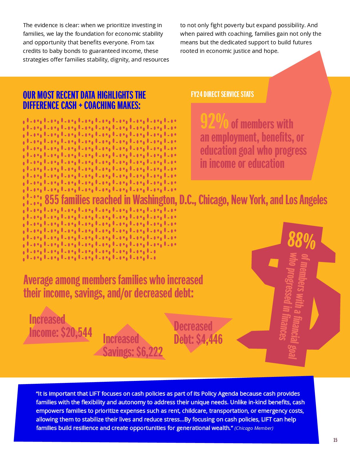 we lay the foundation for economic stability and opportunity that benefits everyone. From tax credits to baby bonds to guaranteed income, these strategies offer families stability, dignity, and resources to not only fight poverty but expand possibility. And when paired with coaching, families gain not only the means but the dedicated support to build futures rooted in economic justice and hope. OUR MOST RECENT DATA HIGHLIGHTS THE DIFFERENCE CASH + COACHING MAKES: 855 families reached in Washington, D.C., Chicago, New York, and Los Angeles 92% of members with an employment, benefits, or education goal who progress in income or education of members with a financial goal who progressed in finances 88% Average among members families who increased their income, savings, and/or decreased debt: Increased Income: $20,544 Increased Savings: $6,222 Decreased Debt: $4,446 “It is important that LIFT focuses on cash policies as part of its Policy Agenda because cash provides “It is important that LIFT focuses on cash policies as part of its Policy Agenda because cash provides families with the flexibility and autonomy to address their unique needs. Unlike in-kind benefits, cash families with the flexibility and autonomy to address their unique needs. Unlike in-kind benefits, cash empowers families to prioritize expenses such as rent, childcare, transportation, or emergency costs, empowers families to prioritize expenses such as rent, childcare, transportation, or emergency costs, allowing them to stabilize their lives and reduce stress…By focusing on cash policies, LIFT can help allowing them to stabilize their lives and reduce stress…By focusing on cash policies, LIFT can help families build resilience and create opportunities for generational wealth.” families build resilience and create opportunities for generational wealth.” (Chicago Member) FY24 DIRECT SERVICE STATS 15