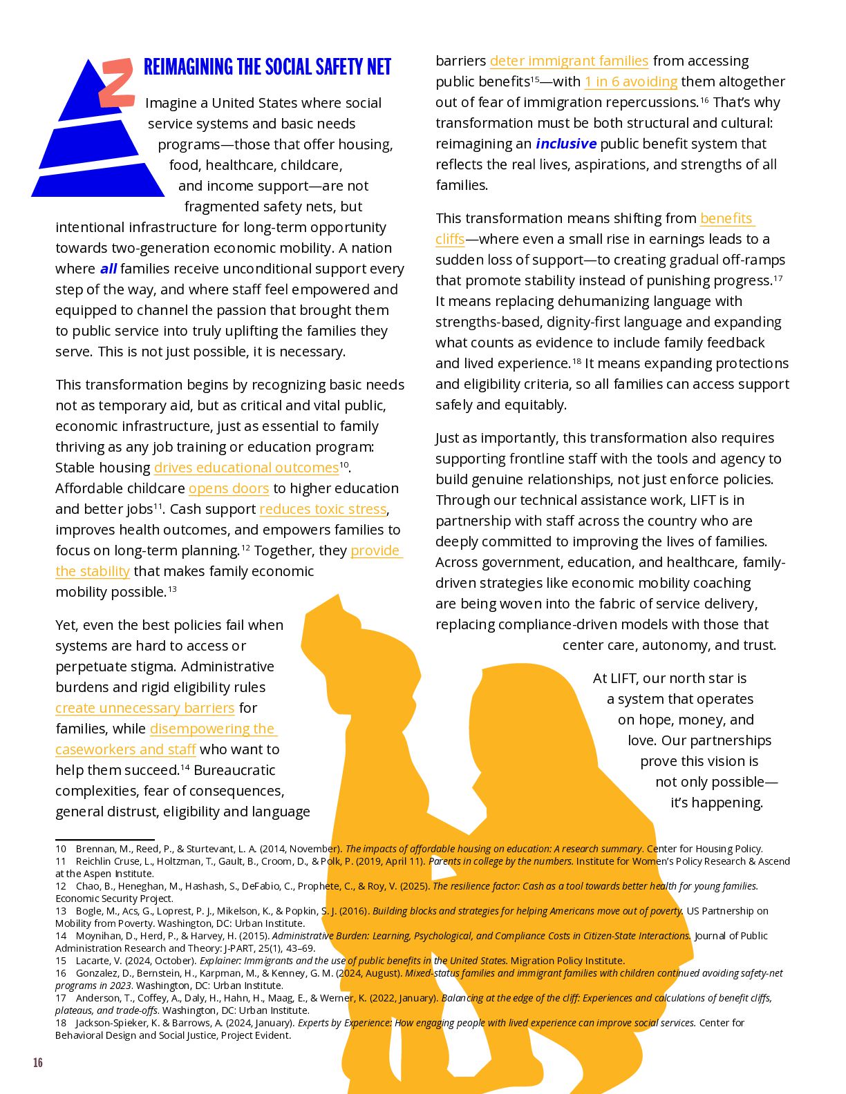 social service systems and basic needs programs—those that offer housing, food, healthcare, childcare, and income support—are not fragmented safety nets, but intentional infrastructure for long-term opportunity towards two-generation economic mobility. A nation where all families receive unconditional support every step of the way, and where staff feel empowered and equipped to channel the passion that brought them to public service into truly uplifting the families they serve. This is not just possible, it is necessary. This transformation begins by recognizing basic needs not as temporary aid, but as critical and vital public, economic infrastructure, just as essential to family thriving as any job training or education program: Stable housing drives educational outcomes10. Affordable childcare opens doors to higher education and better jobs11. Cash support reduces toxic stress, improves health outcomes, and empowers families to focus on long-term planning.12 Together, they provide the stability that makes family economic mobility possible.13 Yet, even the best policies fail when systems are hard to access or perpetuate stigma. Administrative burdens and rigid eligibility rules create unnecessary barriers for families, while disempowering the caseworkers and staff who want to help them succeed.14 Bureaucratic complexities, fear of consequences, general distrust, eligibility and language 10 Brennan, M., Reed, P., & Sturtevant, L. A. (2014, November). The impacts of affordable housing on education: A research summary. Center for Housing Policy. 11 Reichlin Cruse, L., Holtzman, T., Gault, B., Croom, D., & Polk, P. (2019, April 11). Parents in college by the numbers. Institute for Women’s Policy Research & Ascend at the Aspen Institute. 12 Chao, B., Heneghan, M., Hashash, S., DeFabio, C., Prophete, C., & Roy, V. (2025). The resilience factor: Cash as a tool towards better health for young families. Economic Security Project. 13 Bogle, M., Acs, G., Loprest, P. J., Mikelson, K., & Popkin, S. J. (2016). Building blocks and strategies for helping Americans move out of poverty. US Partnership on Mobility from Poverty. Washington, DC: Urban Institute. 14 Moynihan, D., Herd, P., & Harvey, H. (2015). Administrative Burden: Learning, Psychological, and Compliance Costs in Citizen-State Interactions. Journal of Public Administration Research and Theory: J-PART, 25(1), 43–69. 15 Lacarte, V. (2024, October). Explainer: Immigrants and the use of public benefits in the United States. Migration Policy Institute. 16 Gonzalez, D., Bernstein, H., Karpman, M., & Kenney, G. M. (2024, August). Mixed-status families and immigrant families with children continued avoiding safety-net programs in 2023. Washington, DC: Urban Institute. 17 Anderson, T., Coffey, A., Daly, H., Hahn, H., Maag, E., & Werner, K. (2022, January). Balancing at the edge of the cliff: Experiences and calculations of benefit cliffs, plateaus, and trade-offs. Washington, DC: Urban Institute. 18 Jackson-Spieker, K. & Barrows, A. (2024, January). Experts by Experience: How engaging people with lived experience can improve social services. Center for Behavioral Design and Social Justice, Project Evident. barriers deter immigrant families from accessing public benefits15—with 1 in 6 avoiding them altogether out of fear of immigration repercussions.16 That’s why transformation must be both structural and cultural: reimagining an inclusive public benefit system that reflects the real lives, aspirations, and strengths of all families. This transformation means shifting from benefits cliffs—where even a small rise in earnings leads to a sudden loss of support—to creating gradual off-ramps that promote stability instead of punishing progress.17 It means replacing dehumanizing language with strengths-based, dignity-first language and expanding what counts as evidence to include family feedback and lived experience.18 It means expanding protections and eligibility criteria, so all families can access support safely and equitably. Just as importantly, this transformation also requires supporting frontline staff with the tools and agency to build genuine relationships, not just enforce policies. Through our technical assistance work, LIFT is in partnership with staff across the country who are deeply committed to improving the lives of families. Across government, education, and healthcare, family- driven strategies like economic mobility coaching are being woven into the fabric of service delivery, replacing compliance-driven models with those that center care, autonomy, and trust. At LIFT, our north star is a system that operates on hope, money, and love. Our partnerships prove this vision is not only possible— it’s happening. 16