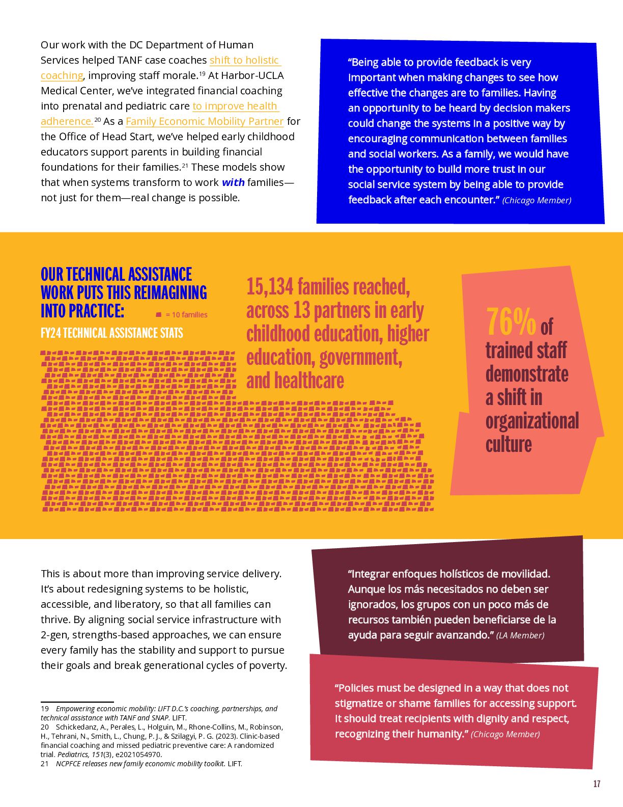 TANF case coaches shift to holistic coaching, improving staff morale.19 At Harbor-UCLA Medical Center, we’ve integrated financial coaching into prenatal and pediatric care to improve health adherence.20 As a Family Economic Mobility Partner for the Office of Head Start, we’ve helped early childhood educators support parents in building financial foundations for their families.21 These models show that when systems transform to work with families— not just for them—real change is possible. This is about more than improving service delivery. It’s about redesigning systems to be holistic, accessible, and liberatory, so that all families can thrive. By aligning social service infrastructure with 2-gen, strengths-based approaches, we can ensure every family has the stability and support to pursue their goals and break generational cycles of poverty. 19 Empowering economic mobility: LIFT D.C.’s coaching, partnerships, and technical assistance with TANF and SNAP. LIFT. 20 Schickedanz, A., Perales, L., Holguin, M., Rhone-Collins, M., Robinson, H., Tehrani, N., Smith, L., Chung, P. J., & Szilagyi, P. G. (2023). Clinic-based financial coaching and missed pediatric preventive care: A randomized trial. Pediatrics, 151(3), e2021054970. 21 NCPFCE releases new family economic mobility toolkit. LIFT. OUR TECHNICAL ASSISTANCE WORK PUTS THIS REIMAGINING INTO PRACTICE: 15,134 families reached, across 13 partners in early childhood education, higher education, government, and healthcare = 10 families = 10 families 76% of trained staff demonstrate a shift in organizational culture FY24 TECHNICAL ASSISTANCE STATS “Being able to provide feedback is very “Being able to provide feedback is very important when making changes to see how important when making changes to see how effective the changes are to families. Having effective the changes are to families. Having an opportunity to be heard by decision makers an opportunity to be heard by decision makers could change the systems in a positive way by could change the systems in a positive way by encouraging communication between families encouraging communication between families and social workers. As a family, we would have and social workers. As a family, we would have the opportunity to build more trust in our the opportunity to build more trust in our social service system by being able to provide social service system by being able to provide feedback after each encounter.” feedback after each encounter.” (Chicago Member) “Integrar enfoques holísticos de movilidad. “Integrar enfoques holísticos de movilidad. Aunque los más necesitados no deben ser Aunque los más necesitados no deben ser ignorados, los grupos con un poco más de ignorados, los grupos con un poco más de recursos también pueden beneficiarse de la recursos también pueden beneficiarse de la ayuda para seguir avanzando.” ayuda para seguir avanzando.” (LA Member) “Policies must be designed in a way that does not “Policies must be designed in a way that does not stigmatize or shame families for accessing support. stigmatize or shame families for accessing support. It should treat recipients with dignity and respect, It should treat recipients with dignity and respect, recognizing their humanity.” recognizing their humanity.” (Chicago Member) 17