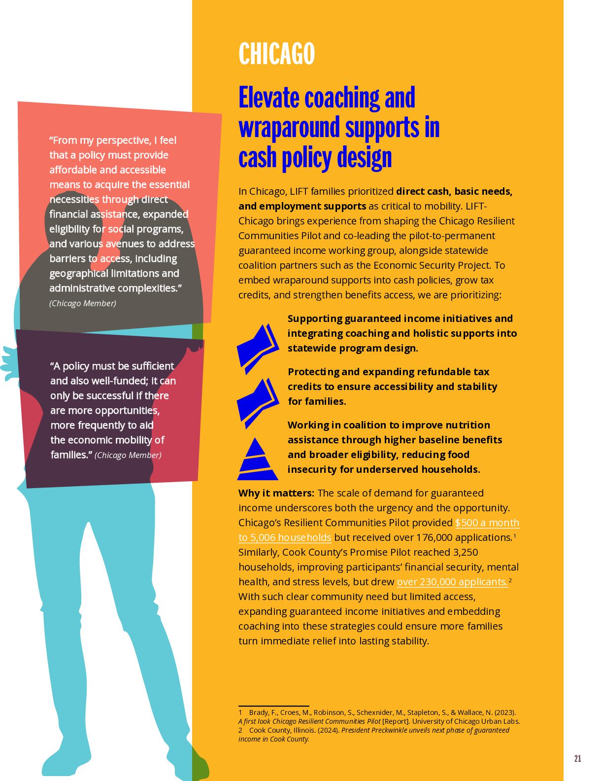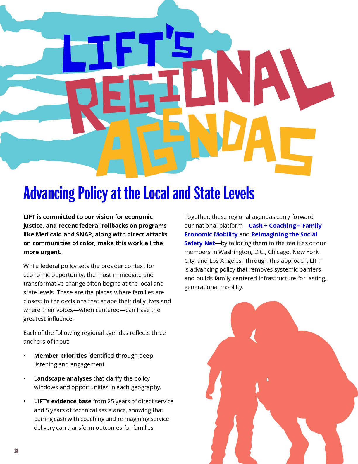 committed to our vision for economic justice, and recent federal rollbacks on programs like Medicaid and SNAP, along with direct attacks on communities of color, make this work all the more urgent. While federal policy sets the broader context for economic opportunity, the most immediate and transformative change often begins at the local and state levels. These are the places where families are closest to the decisions that shape their daily lives and where their voices—when centered—can have the greatest influence. Each of the following regional agendas reflects three anchors of input: • Member priorities identified through deep listening and engagement. • Landscape analyses that clarify the policy windows and opportunities in each geography. • LIFT’s evidence base from 25 years of direct service and 5 years of technical assistance, showing that pairing cash with coaching and reimagining service delivery can transform outcomes for families. Together, these regional agendas carry forward our national platform—Cash + Coaching = Family Economic Mobility and Reimagining the Social Safety Net—by tailoring them to the realities of our members in Washington, D.C., Chicago, New York City, and Los Angeles. Through this approach, LIFT is advancing policy that removes systemic barriers and builds family-centered infrastructure for lasting, generational mobility. 18